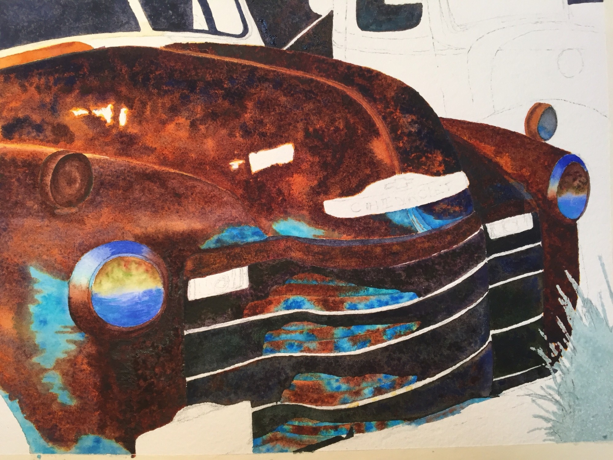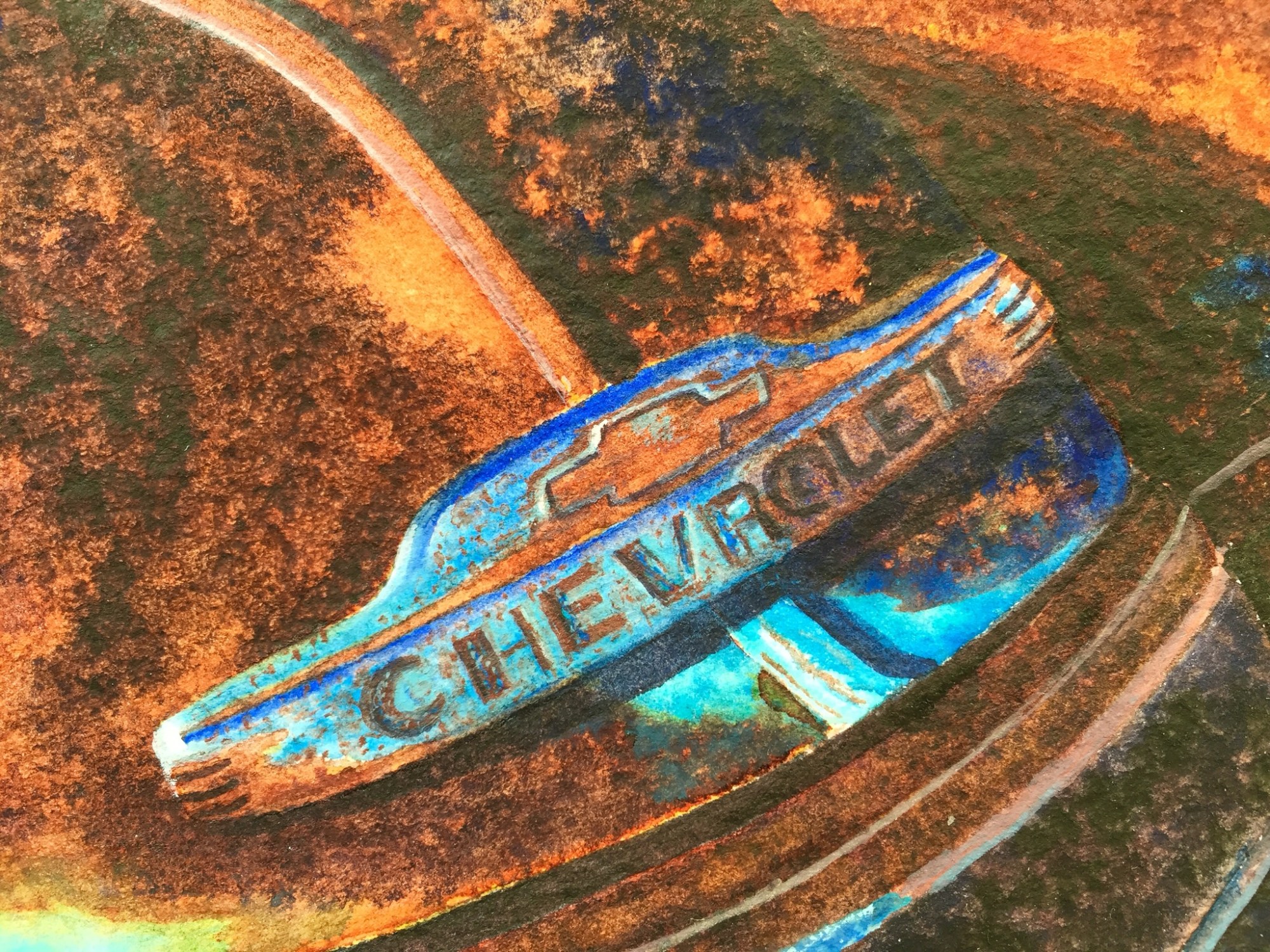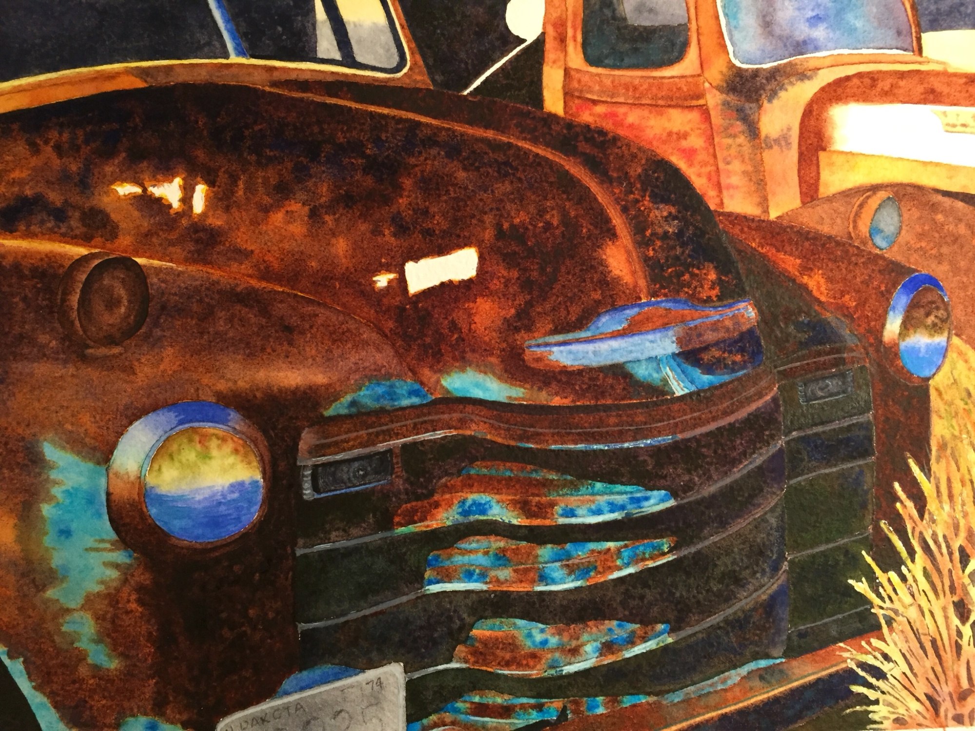 #4 in the Series Aging Gracefully, this beautiful Chevrolet pickup is biding her time in a field in southwestern North Dakota. The artist captures the character of the forgotten vehicle with deep, rich colors of turquoise and rusty browns.
