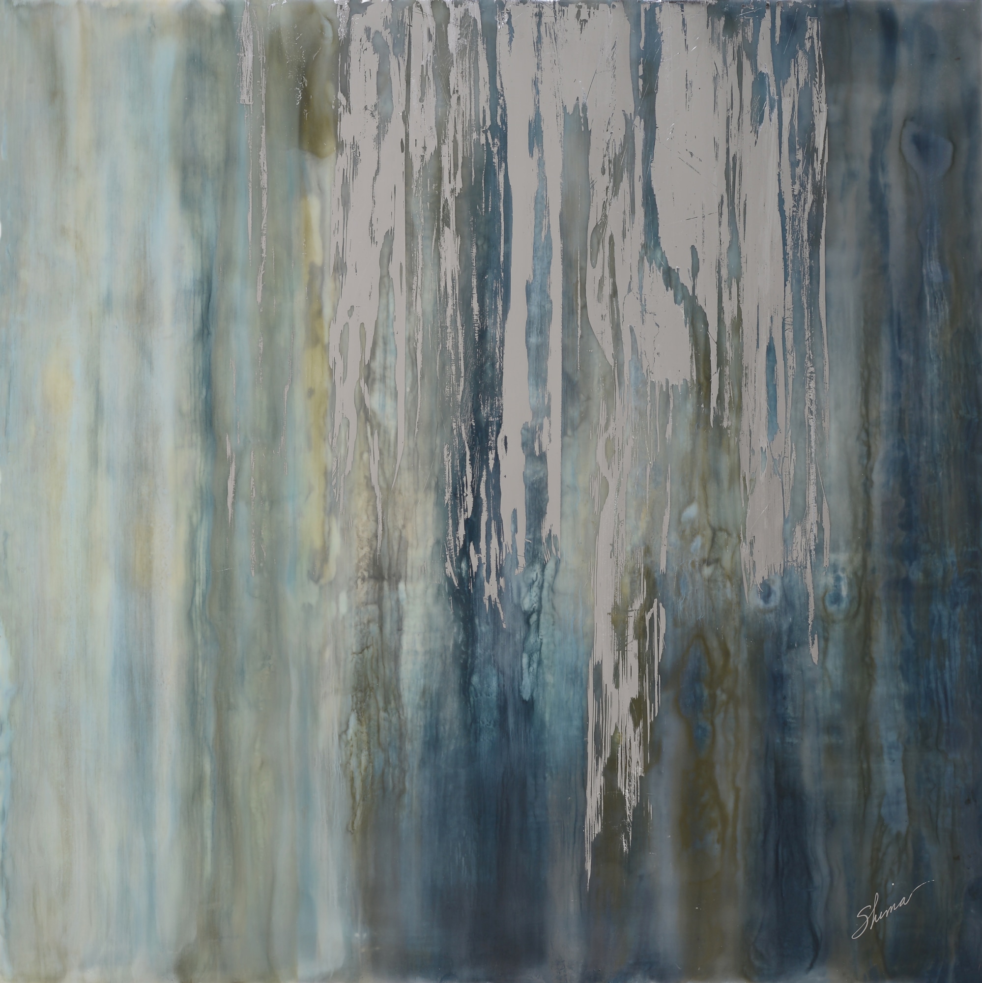 "The Weeping Wall" in the "Sanctum Strata collection. Sacred holiness held within the boundaries of our natural world give way to the timeless flow and infinite movement of Light and life. There is omnipresent peace and boundless Spirit beyond the appearance of an illusory horizon. The depth, luminosity and translucency of 50+ layers of pigmented beeswax, each fused with the flame of a torch draw you into an underlying sense of peace. This work is an original encaustic painting by Shima Shanti completed in July 2020.