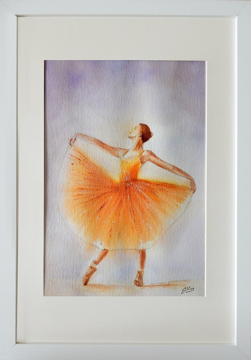 Gentle as the sun expresses lightness and perfection of a ballerina's movements. Painted on Hahnemuhle 300 gsm fine art paper using primarily Winsor & Newton Professional and Art Spectrum Watercolours.