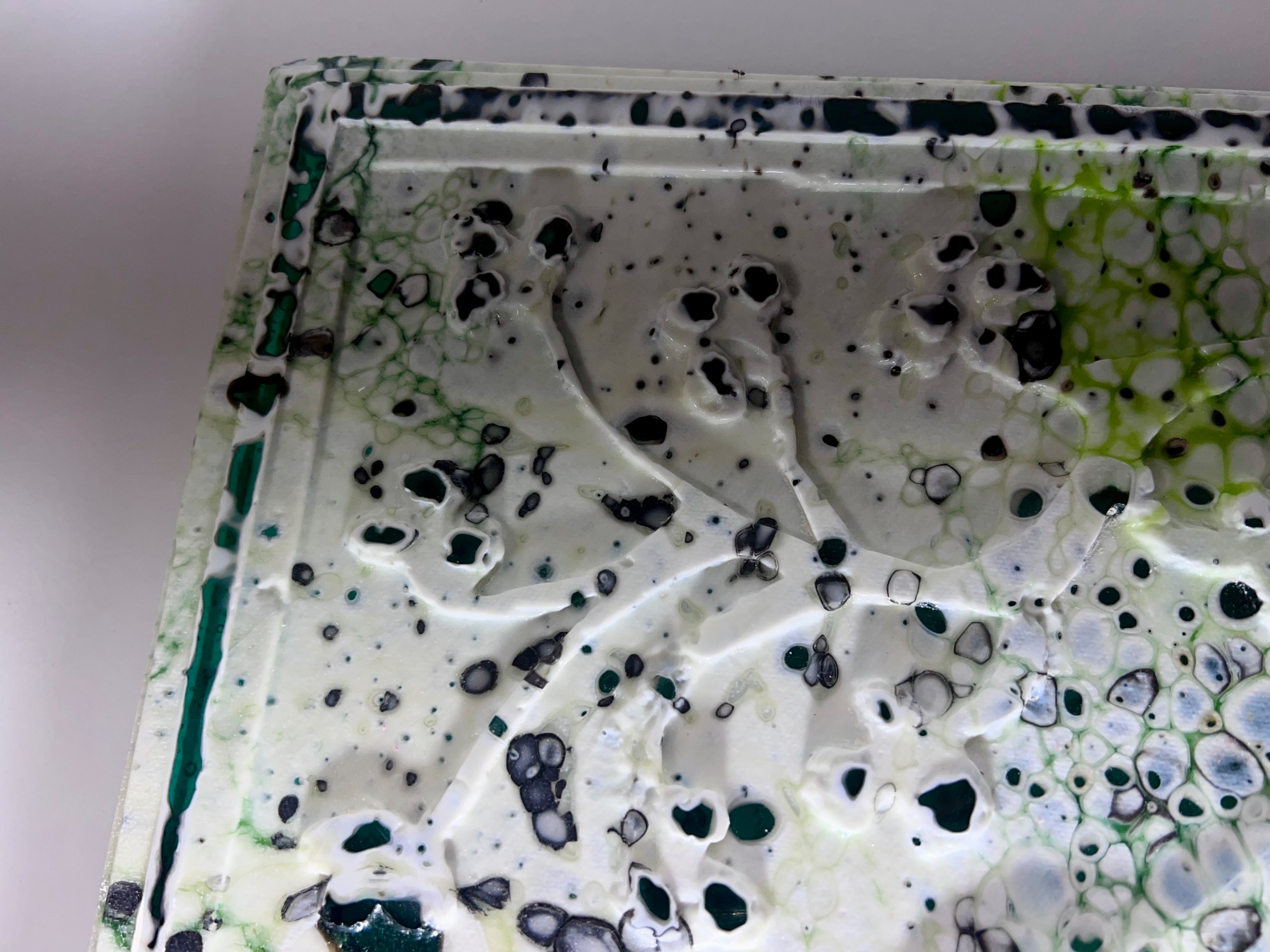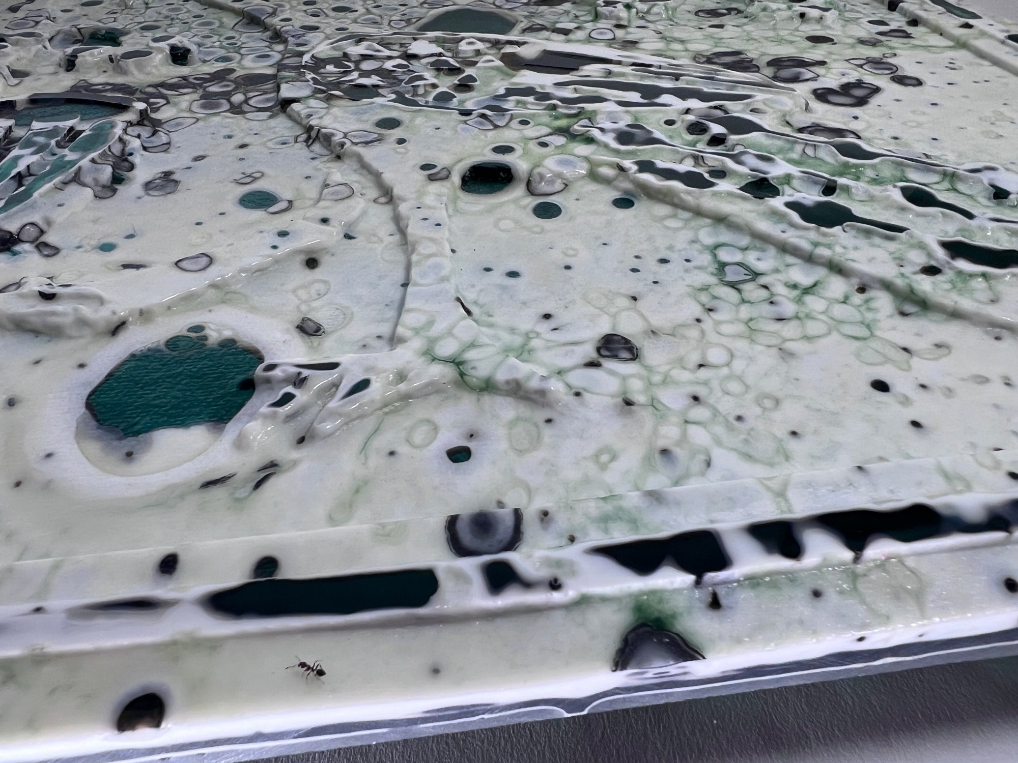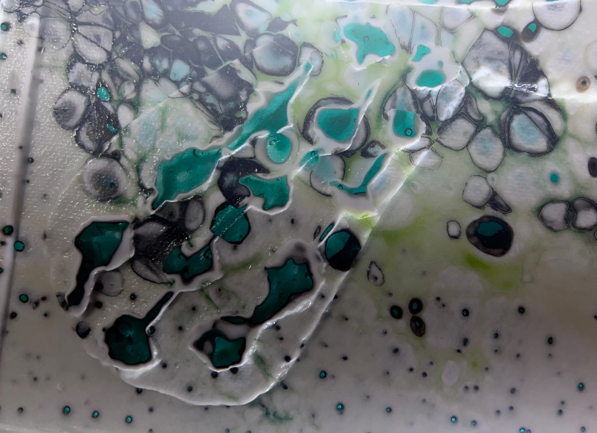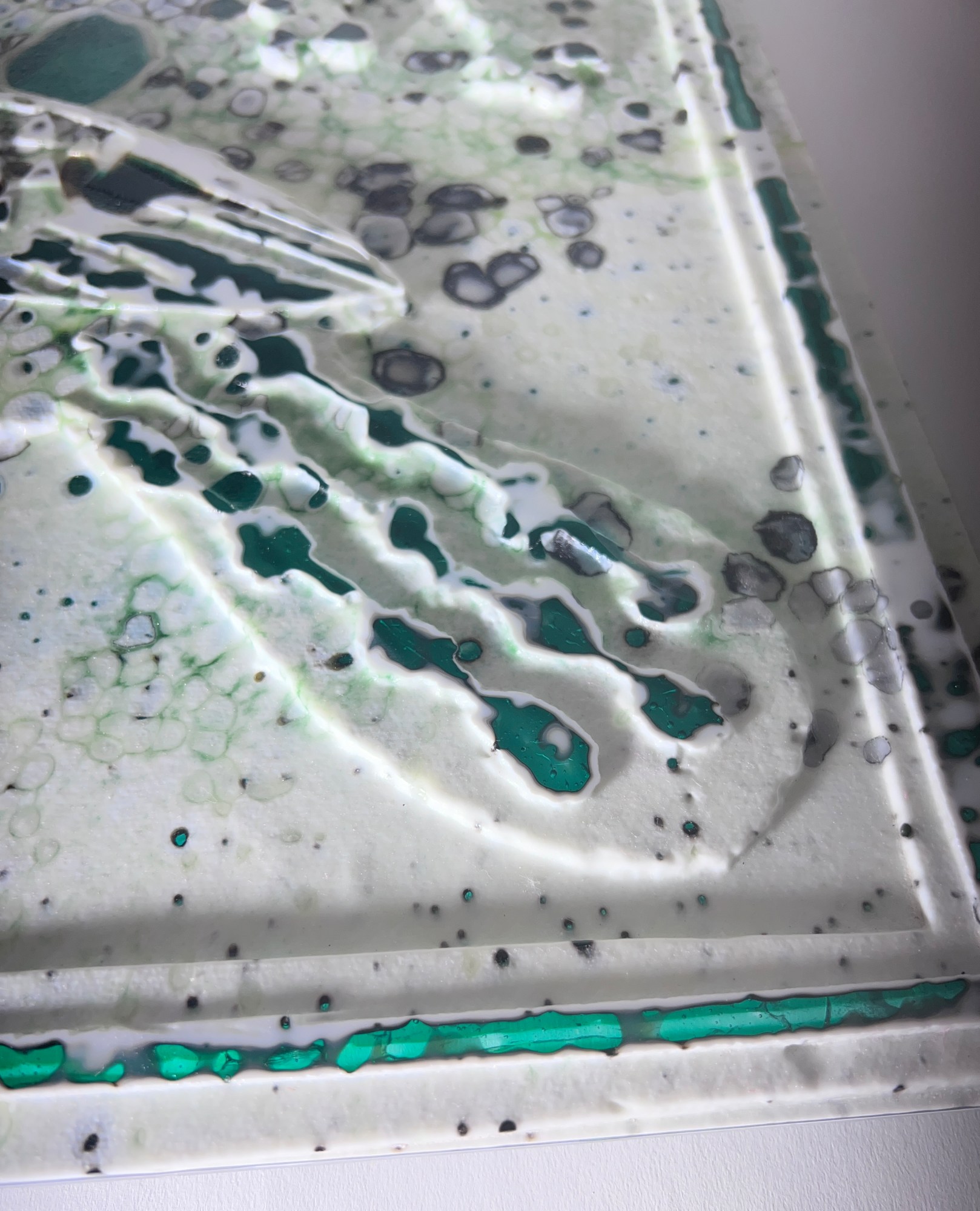 It is made by first boiling the glass then slumping over fibre paper, grinding and polishing the high points back to reveal the layers below.