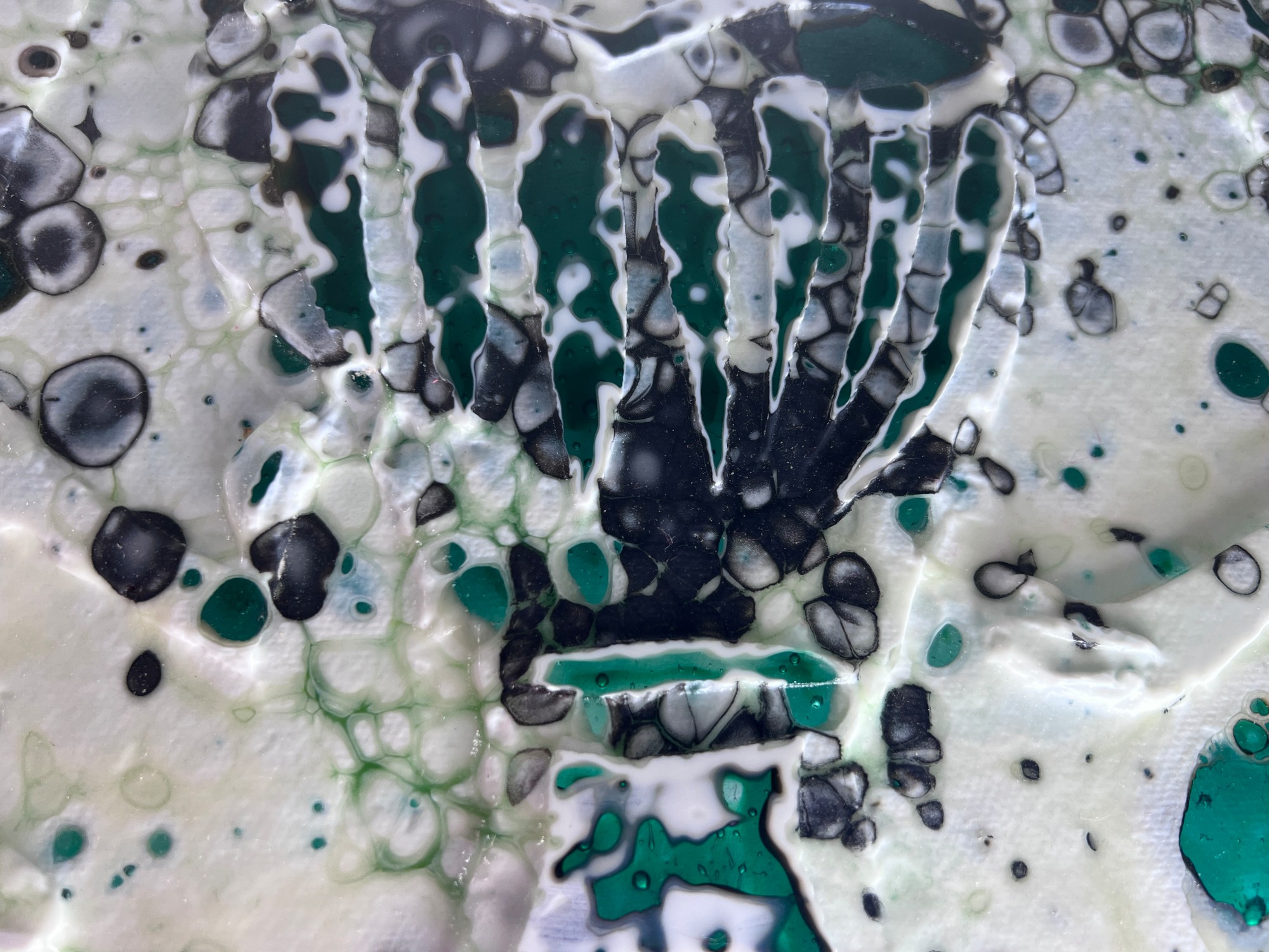 This piece is an homage to Lago Maggiore in north Italy where my dad came from. We used to go every year from England on holidays. I always felt at home there – it tugged at my heart, it’s the land of my roots. I loved going to the Borromeo Islands in the lake, especially Isola Bella with its white peacocks and grottos. This piece represents the ancient stone carvings in bas relief that are everywhere in Italy, often so old that they are worn, with lichen growing on them.