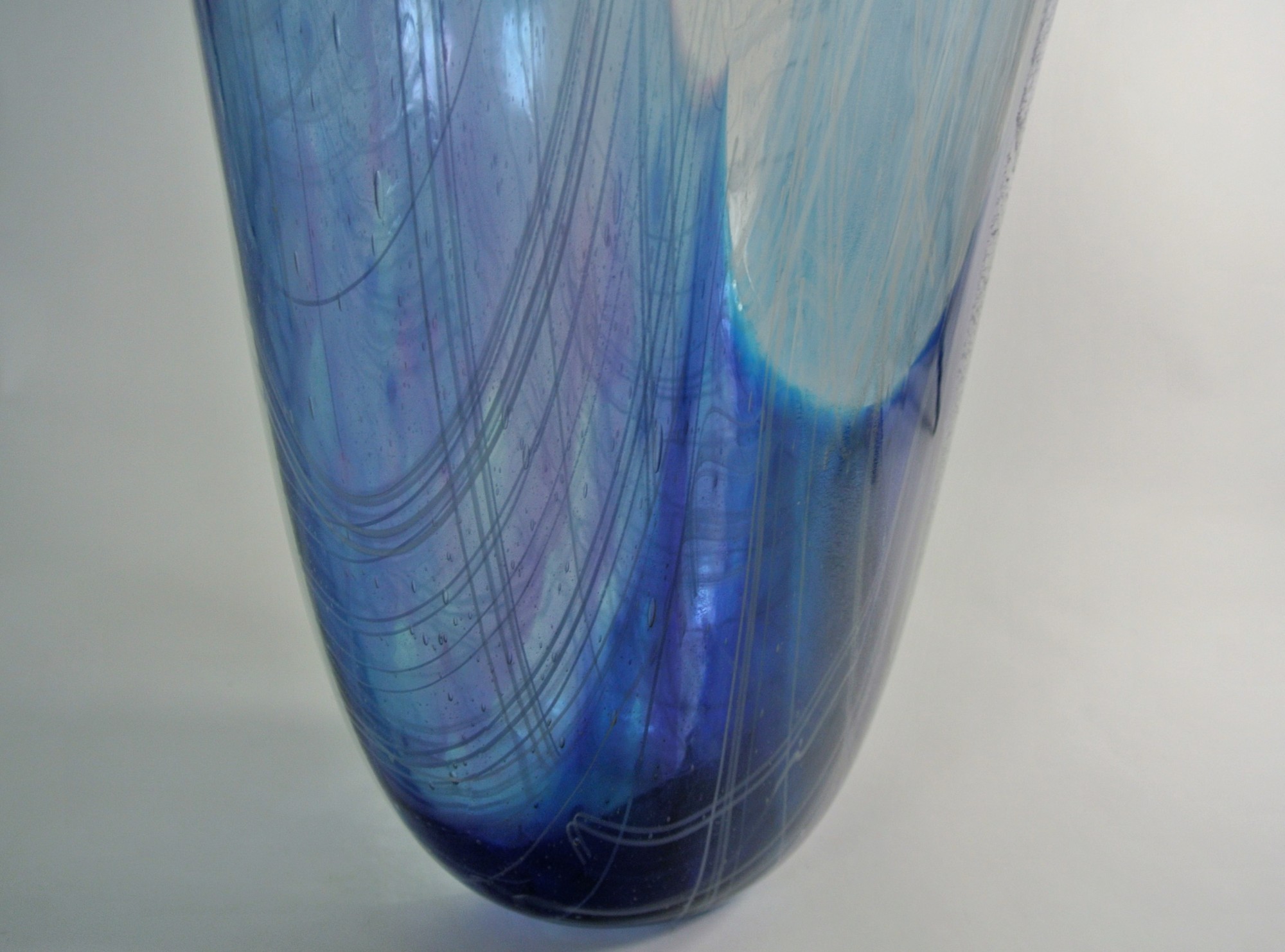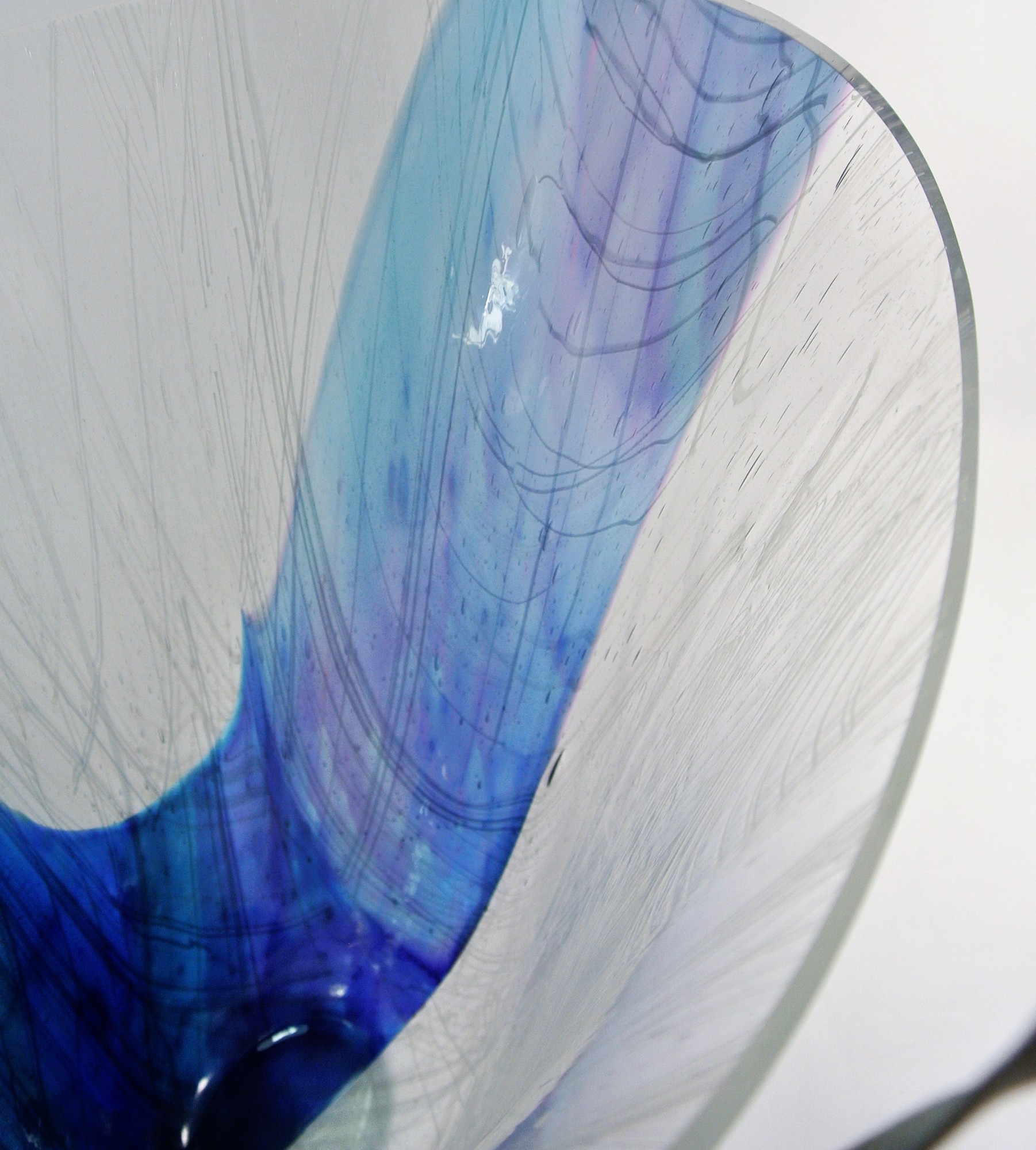 This vessel is inspired by creating a difference and not following convention. The tops are not circular and are cut at an angle. The lines are not straight or parallel. The transparent glass allows a different perspective from every angle, with lines crossing. There is a certain excitement in their form. This piece is made using glass stringers fused onto glass sheet, then cut and refused with coloured glass. They are slumped through a hand cut ring, the edges are then ground and polished to give a level surface.