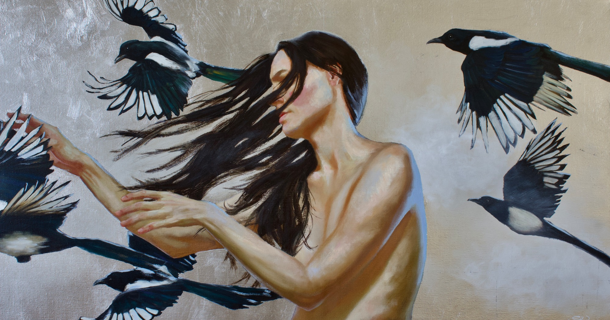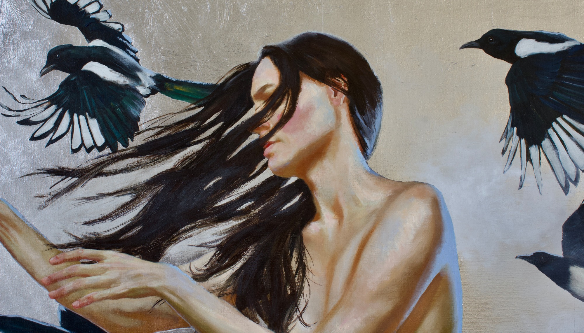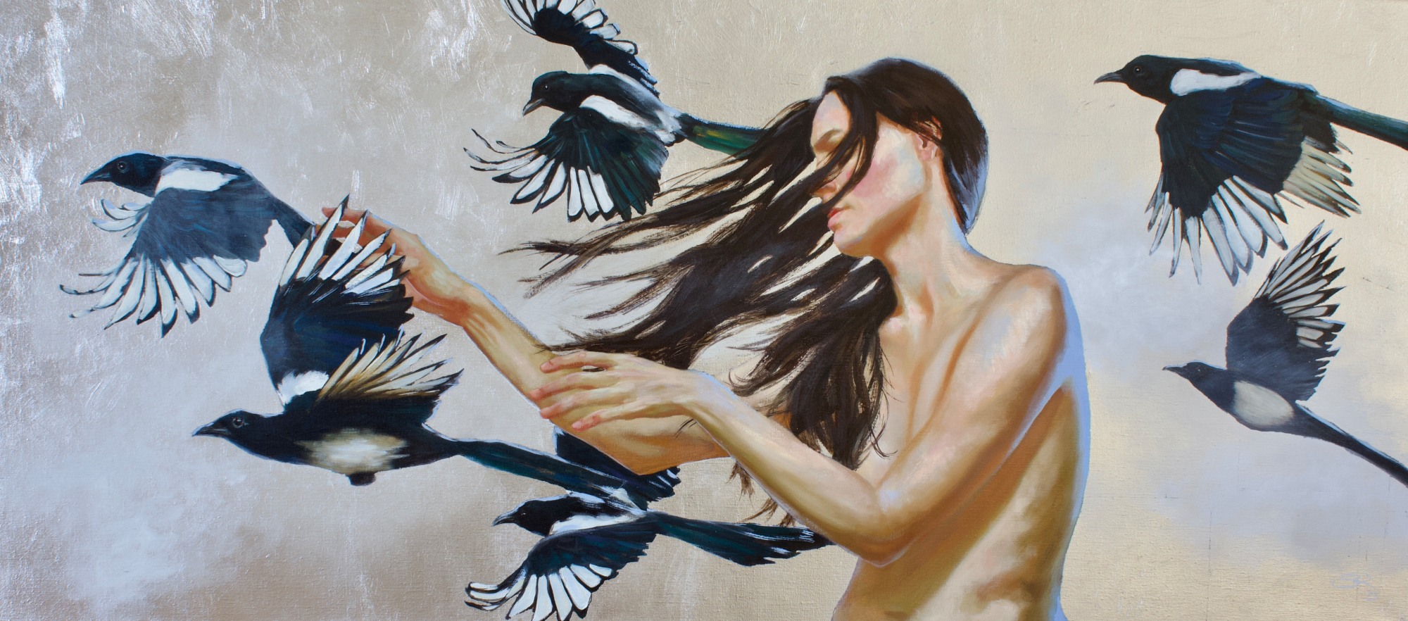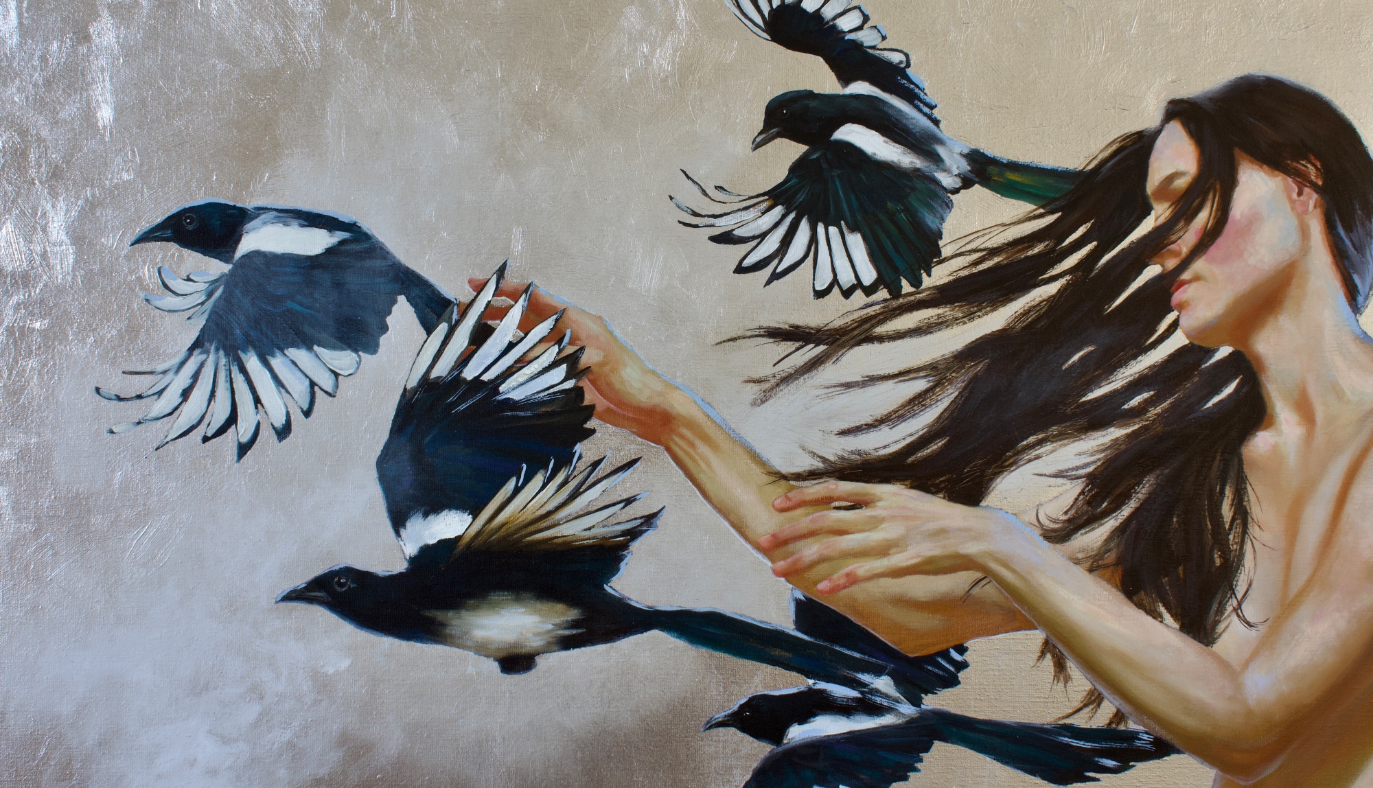 An imaginative painting depicting a deeply felt longing for liberation. A woman with loose hair in the wind and magpies flying by. The silver in the background keeps the painting in movement and constant change, depending on the reflection and perspective of the viewer.