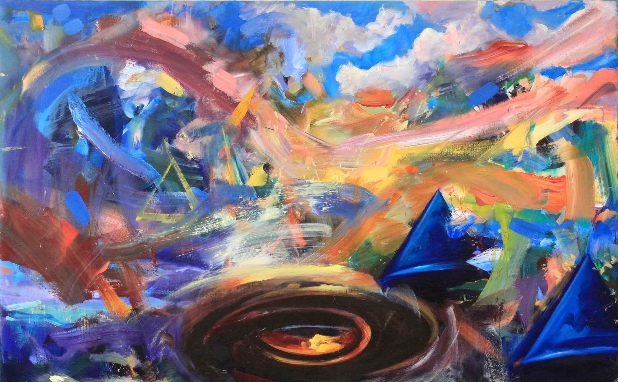 This multi-panel painting is composed of solid abstract shapes juxtaposed with fleeting clouds, rays of light, delicate butterflies and hummingbirds. Within this constant shifting and movement there are moments of repose and reflection. I had initially intended to create two separate paintings, but the composition gradually merged into one. By working with different panels I have a greater sense of freedom that leads to more experimentation.