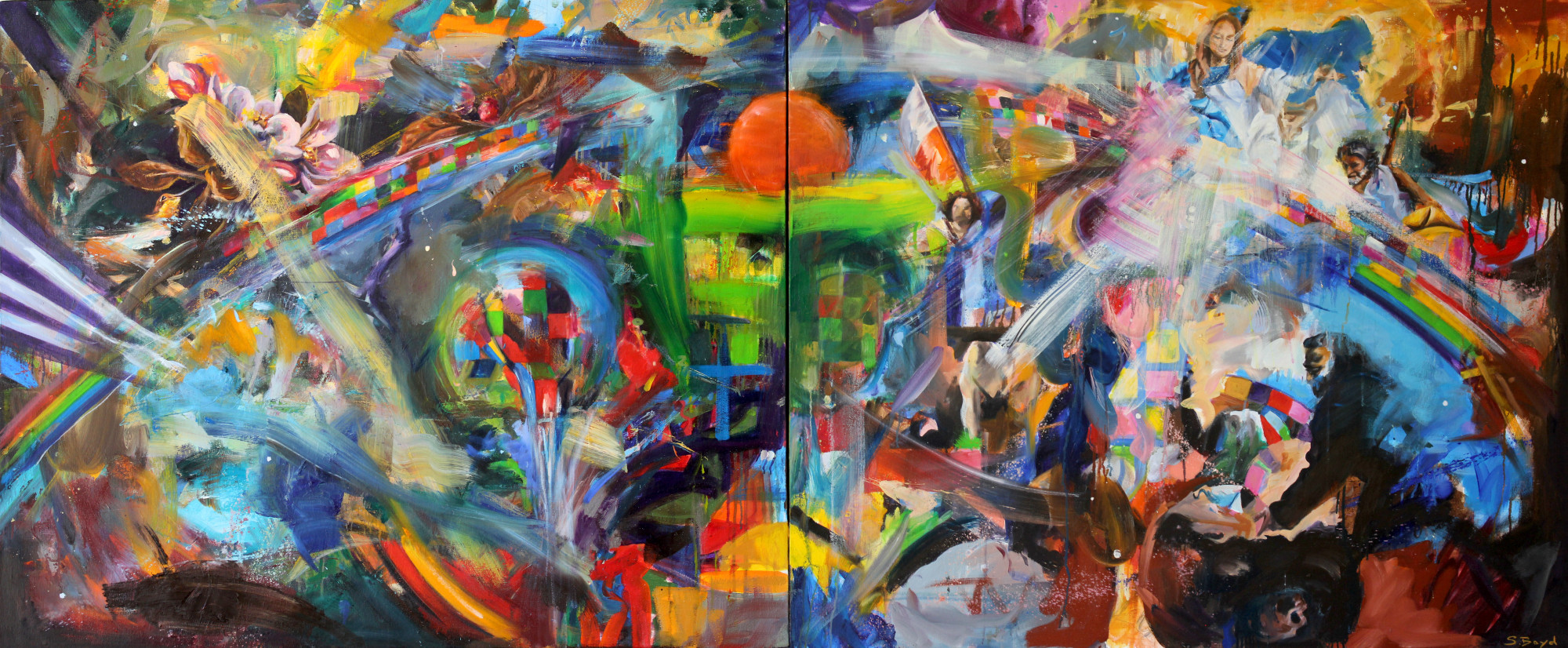 This painting was inspired by a painting of Giovanni Tiepolo that I saw at the museum of fine art in Buenos Aires. To the left of the composition there is a hummingbird suggesting a fleeting moment of joy and beauty, similar to the ephemeral nature of a rainbow. I decided that the painting should be diptych because it was important for me to suggest a simultaneous feeling of unity and separation.