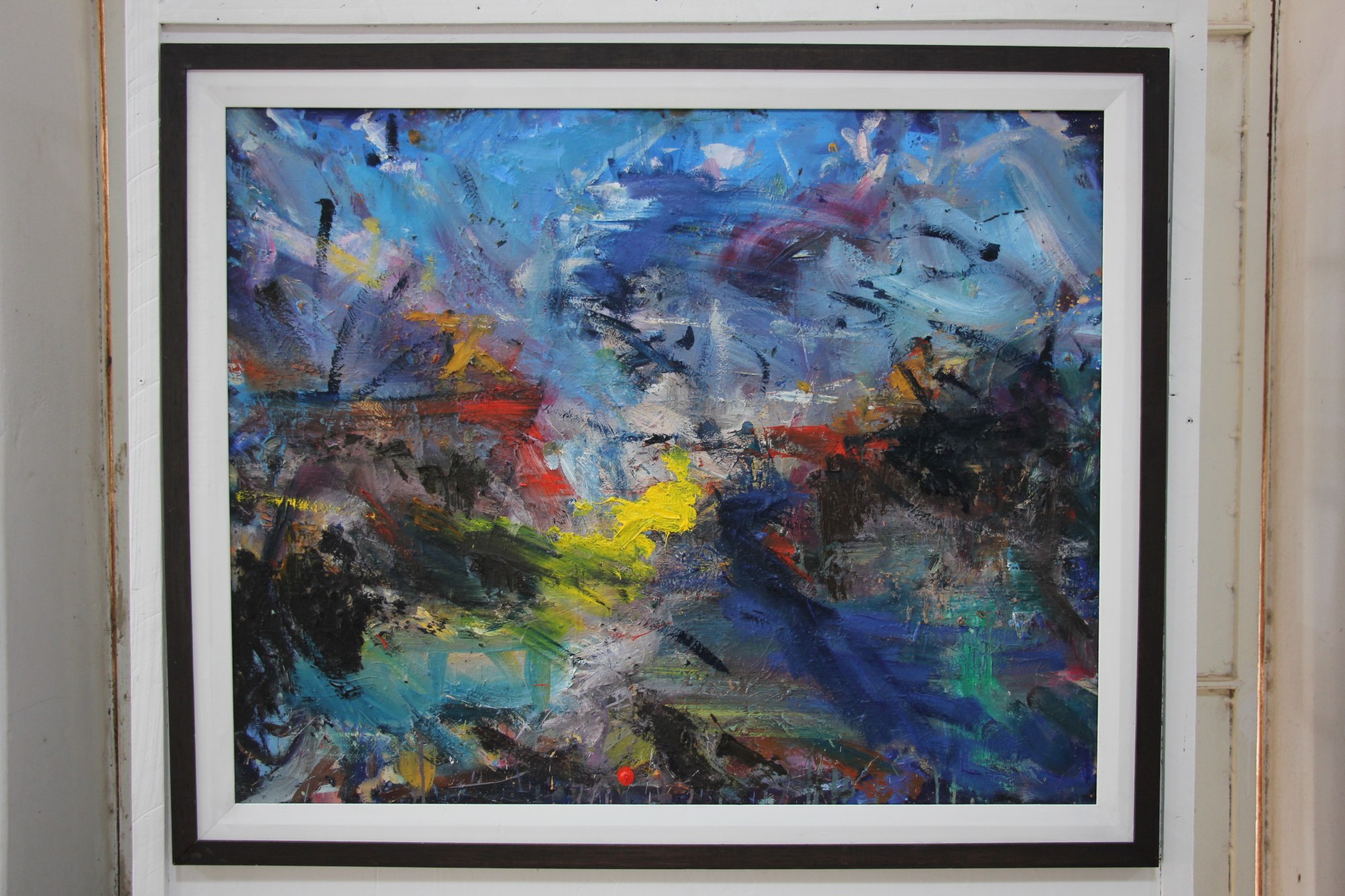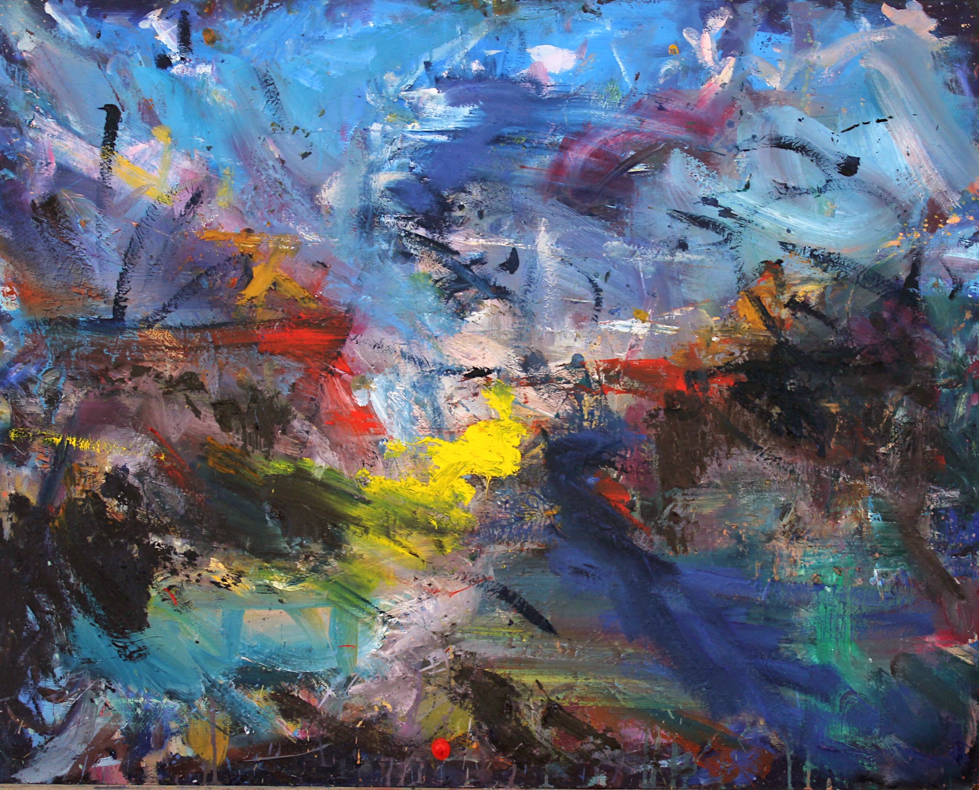 While this painting evolved, I had a growing sense that the work needed to express the physical density of earth through the darker tones at the lower part of the composition, while gradually rising upwards towards lighter, more atmospheric sky blues.