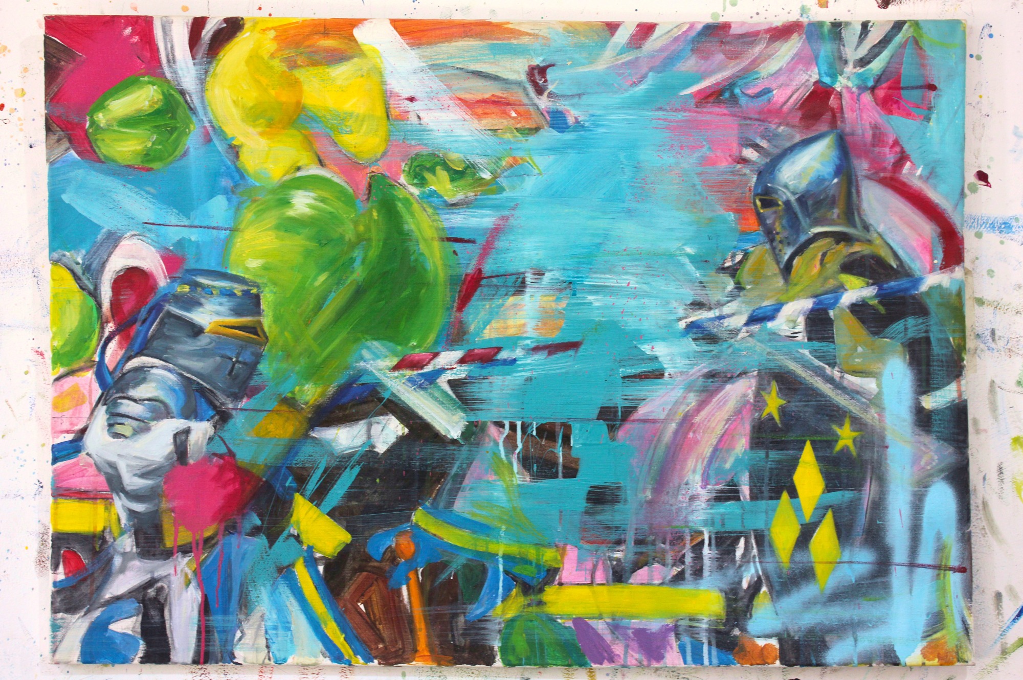The Jousters Banquet is a painting from 2008 where I was fusing together two elements from my childhood imagination and memories, knights and traditional English boiled sweets.