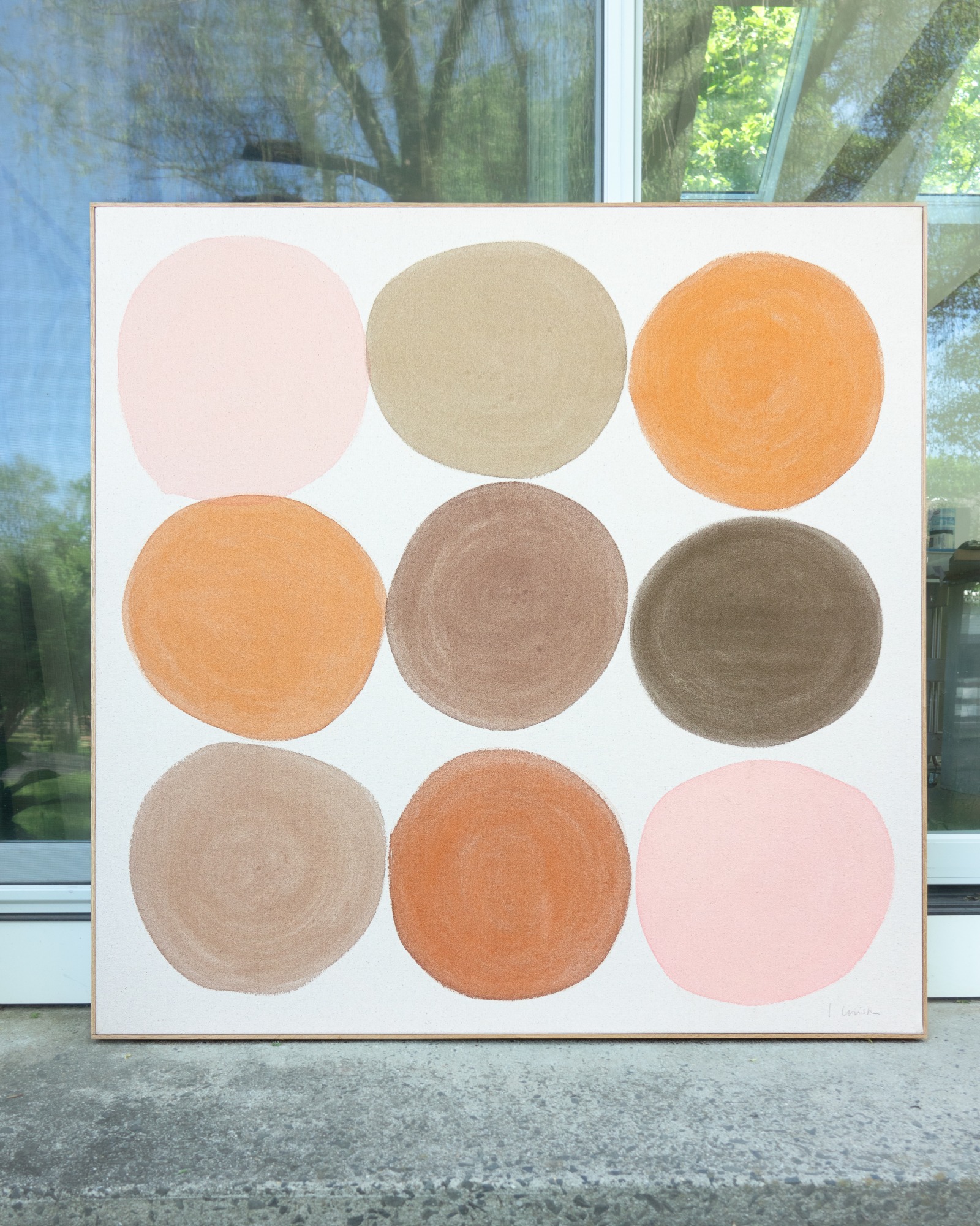 The painting consists of nine circles in warm earth tones. They are less clearly defined and internally more irregular than usual and therefore radiate something rustic and natural. The painting is reminiscent of warm summer earth, of the scent that rises when the first drops of a summer rain fall to earth, of summer vacations spent as a child in Tuscany.