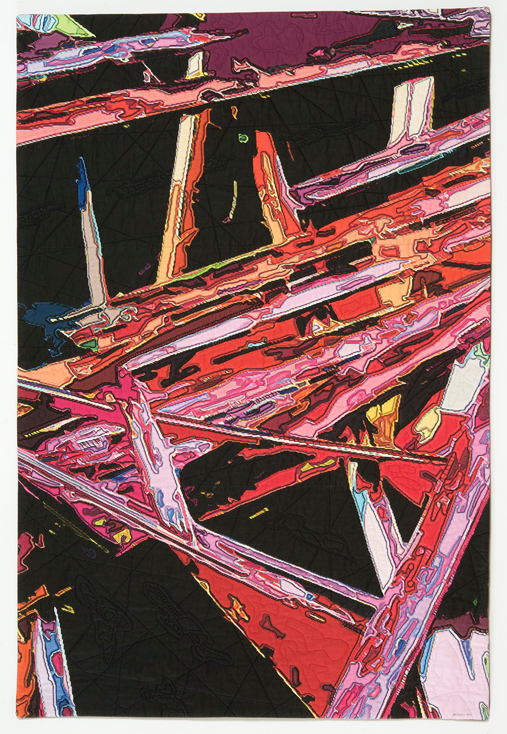 The process of this piece started with a photograph, then applying numerous transformations in Adobe Photoshop. A small abstracted area from the resulting image was chosen and printed out on cotton, forming the quilt sandwich using Warm and Natural batting and quilting.