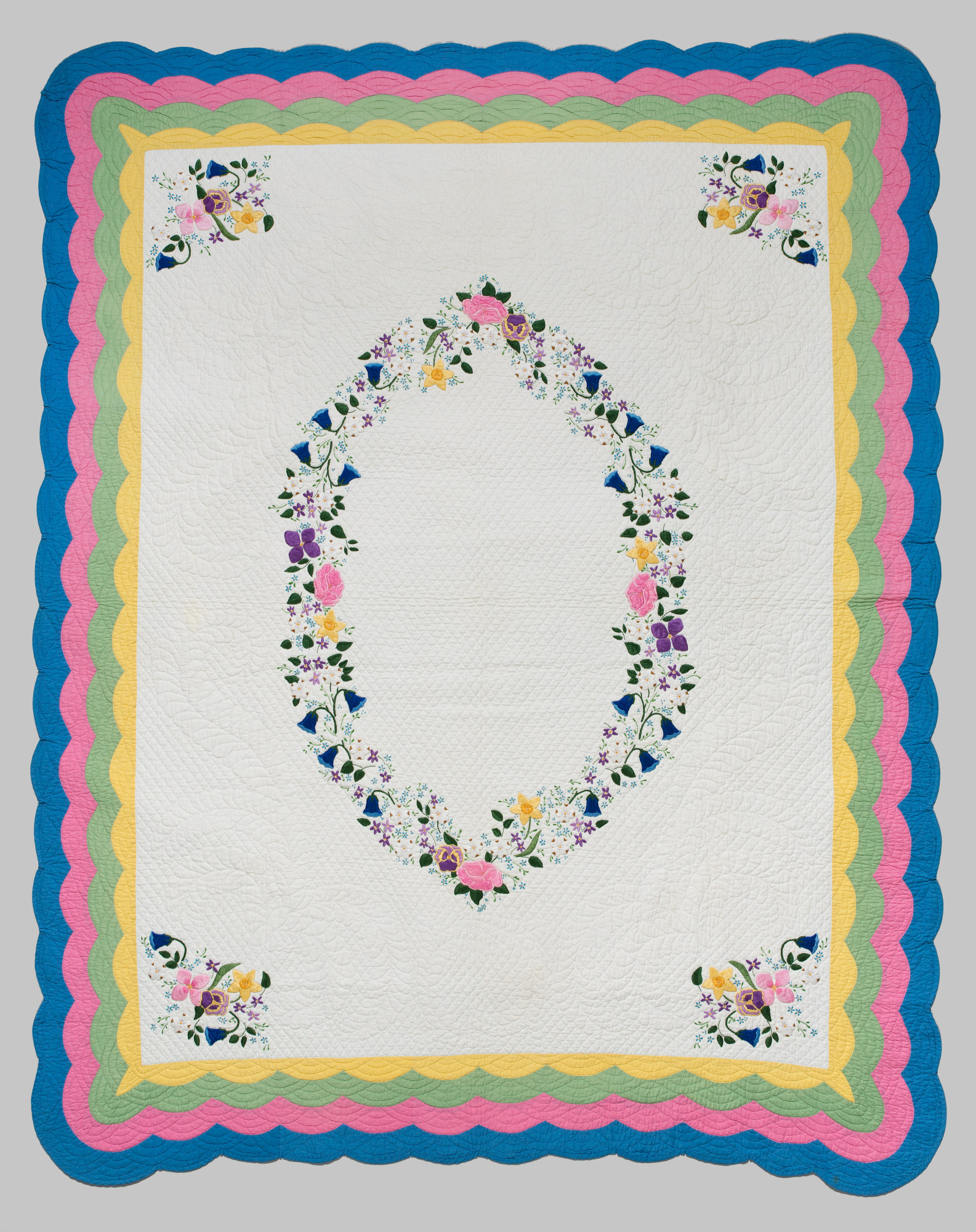 White cotton whole cloth quilt with pink, aqua, yellow cotton strips appliqued to form a scalloped border. Quilt center is an embroidered floral oval of colored flowers surrounding joined hearts to make the Bridal Wreath Center. Lucy helped her mother, Hattie Geiger Hilty quilt this one. It has flowing feathers around the wreath designs. Hattie made four identical quilts--one for each of her children.