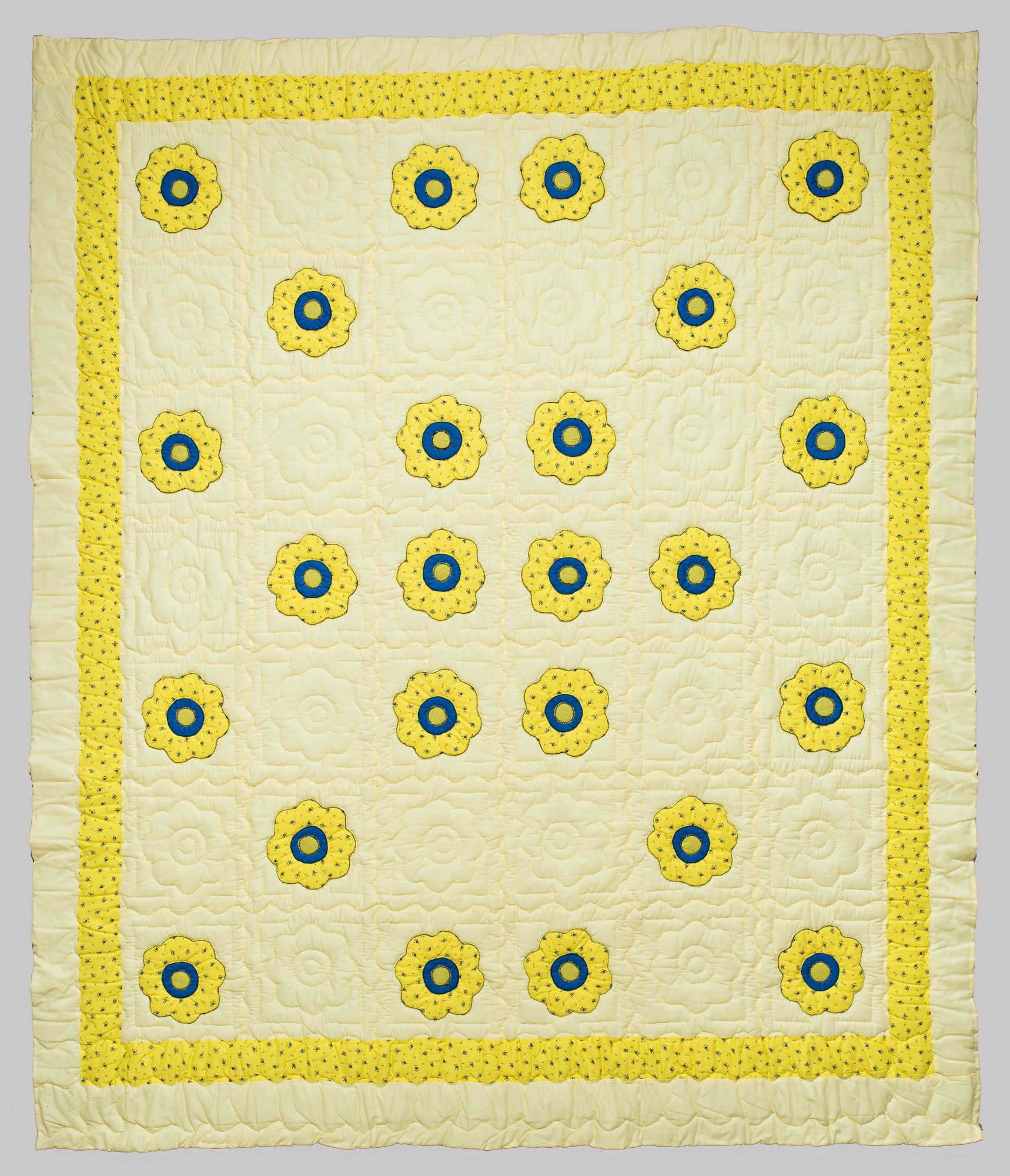 Dark yellow cornflowers are machine appliqued in a medallion pattern on pale yellow background. Bower said she made it in about ten days during January of 1977.