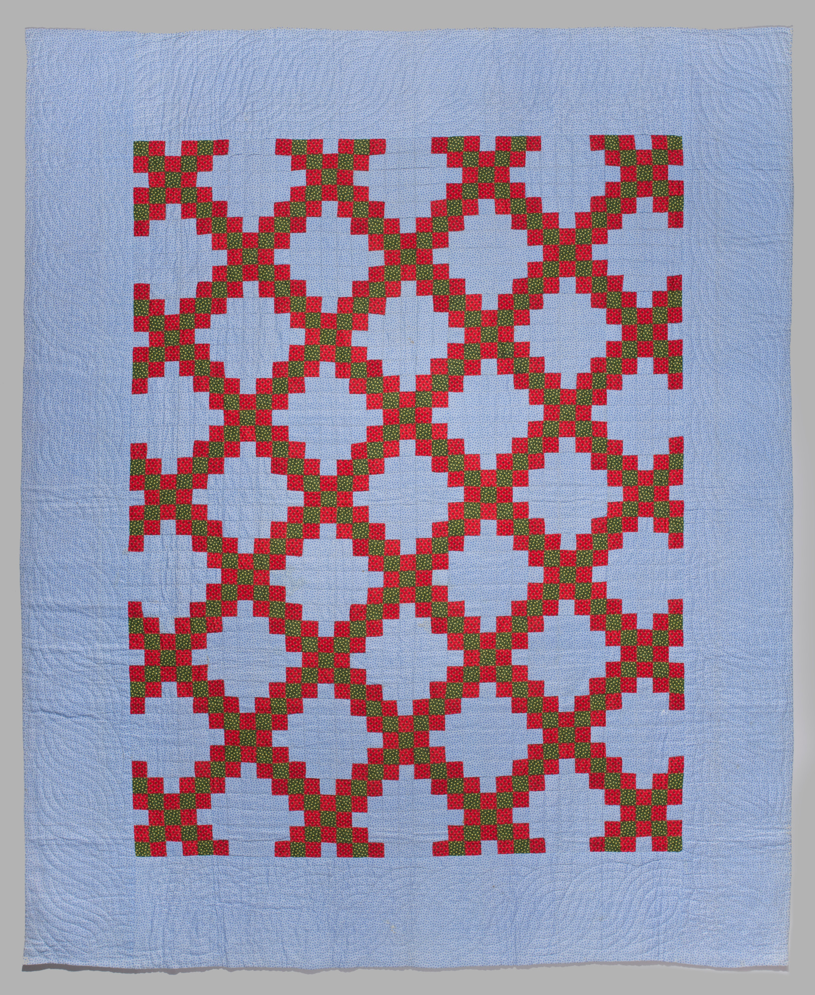 The Irish Chain and Double and Triple Irish Chains were popular patterns developed in the early 1800's. This is a classic piece with strong color and wonderful calico prints.