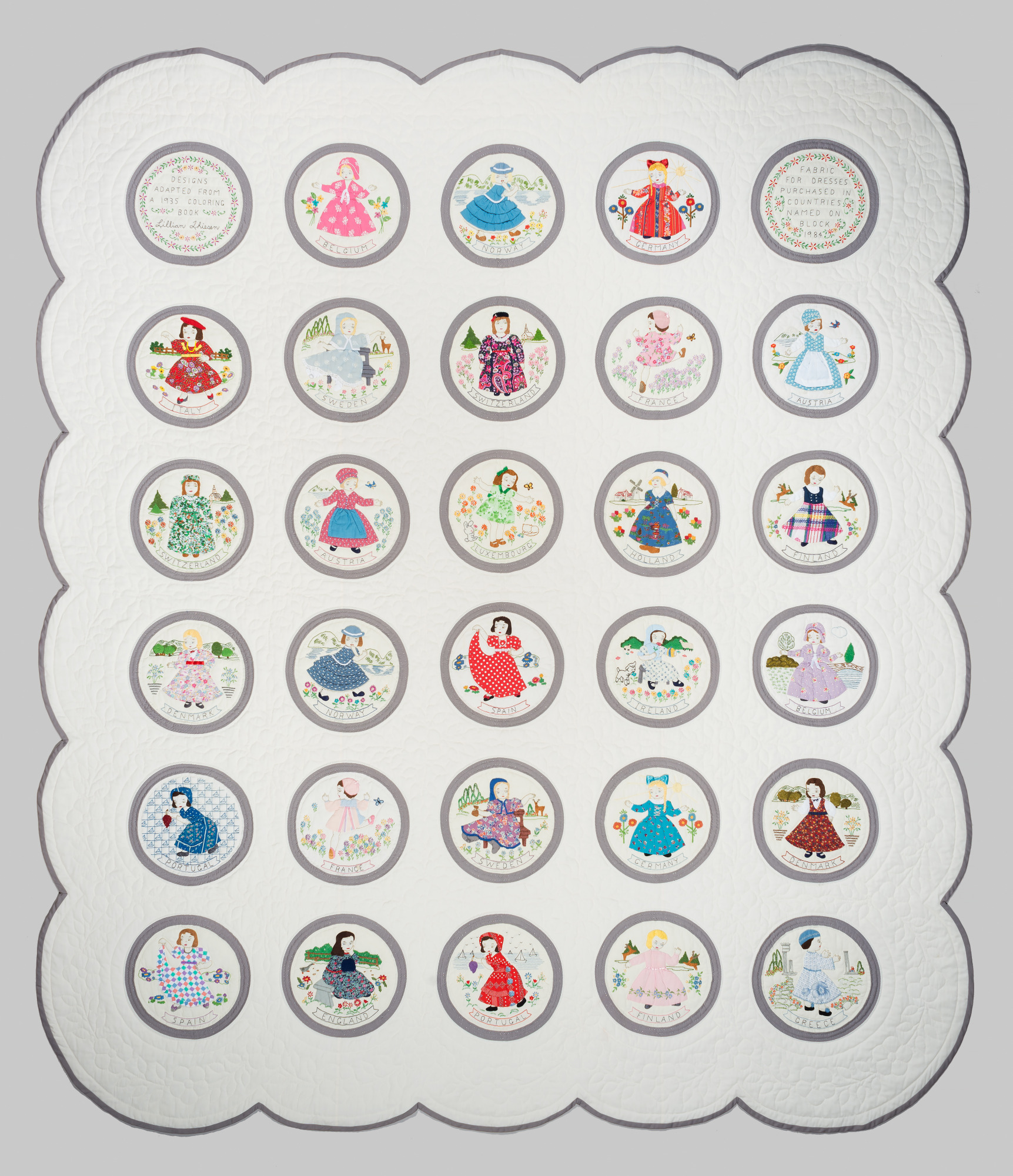 Figures of girls in European dress are adapted from 1939 coloring book. This quilt won a prize at the California State Fair in 1985.