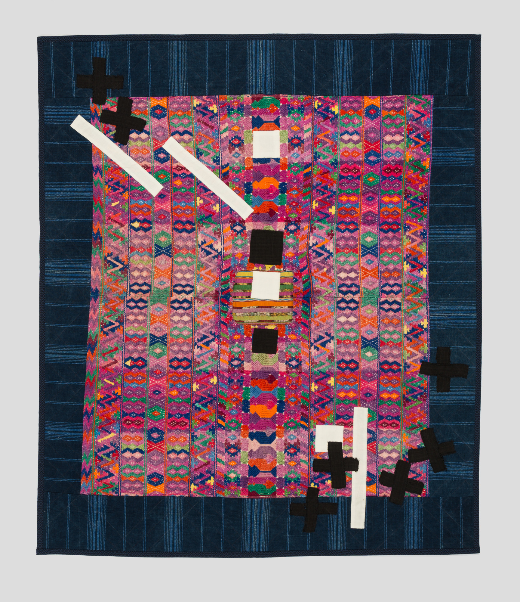 A rectangle, measuring 5” x 5.5” ,is surrounded by strips of woven patterns of bright colors and surrounded by borders measuring 3.25”, 4”, 5” respectively. White squares and strips in addition to black crosses have been placed in the center field and on diagonal corners. The composition has been machine pieced, hand and machine appliqued and machine quilted. The quilt is bound with a binding measuring .5.”