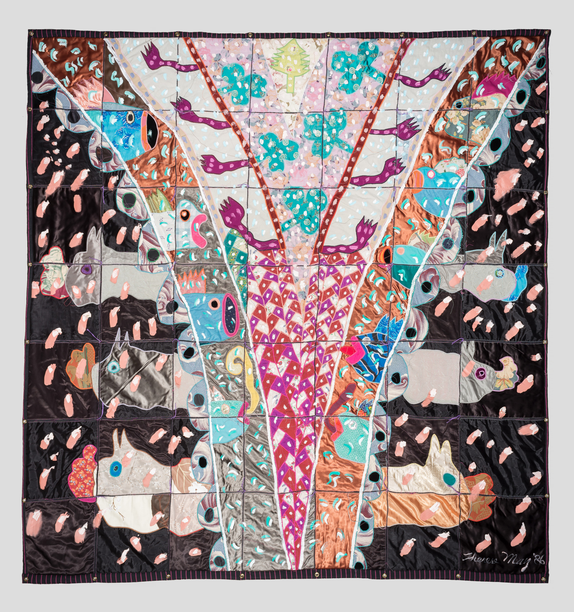There are 49 11.5" by 11.5" blocks stitched with crude zig-zag, painted motif in a large "V" shape including fish heads, chicken heads, and three leaf clovers, and trees.
