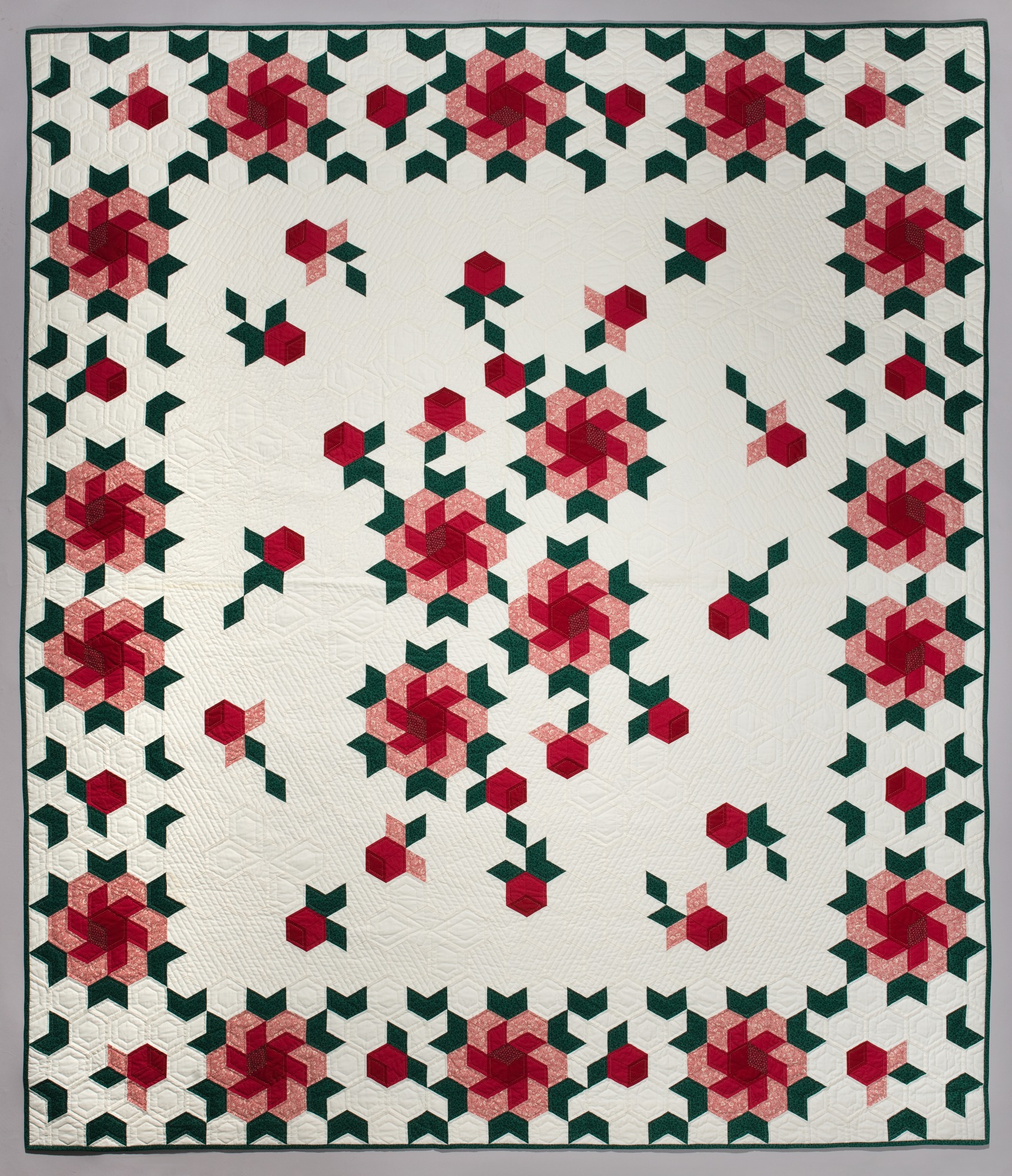 The quilt is constructed from 1566 diamonds and hexagons, 10 butterflies in quilting design. The quilting took over 200 hours, over a four month span. Center is quilted mainly with slanted straight lines and the ten butterflies. Outer edges quilted in the hexagon and diamond pieces. It is signed and dated on back lower edge.