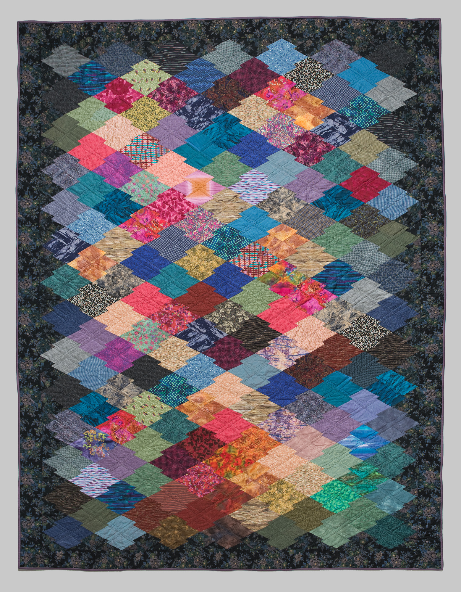 Fabric back with turquoise woven in one direction, blue in the other. Lucy took a class from Karen Matsumoto on the art of Japanese quilt making. She had become interested in the Japanese art when she taught in Post WWII Japan. This was the most difficult quilt that Lucy ever pieced. Larger than her usual size, required the help of friends to shift during sewing. She used a template to cut the blocks of colored fabrics. The pattern is Sashido called Pine Bark Diamond. Lucy did not finish the hand quilting before she dies so her friends in the East Bay Heritage Group, the Crazies, finished the quilt in her design after her death.