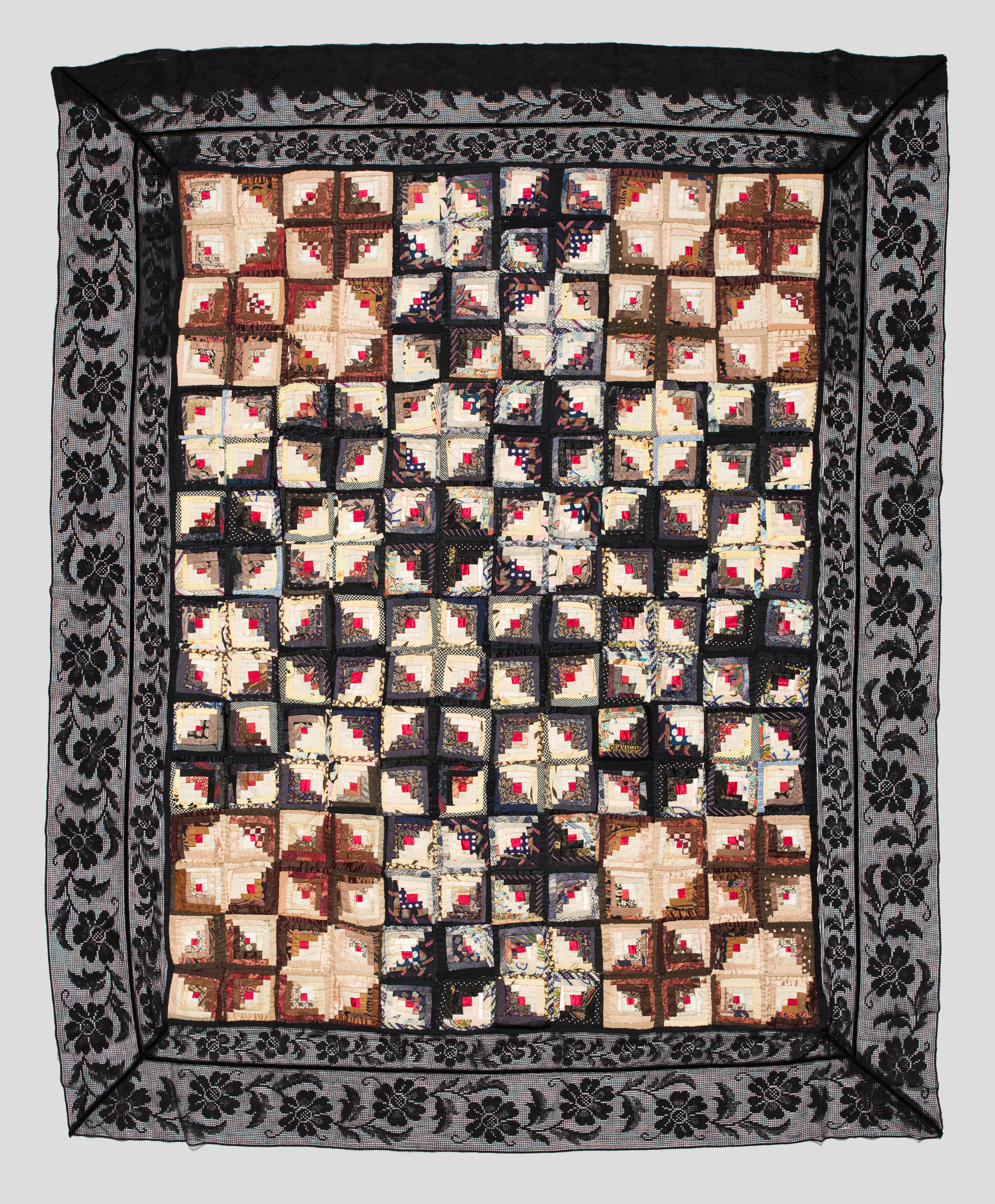 Log Cabin patterns were known to be made using silk, satin, and velvet fabrics. The unfinished back of this quilt shows the miscellaneous collection of woven checks and stripes and small prints used as the foundation.