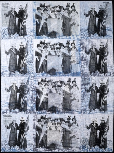 Como artista que trabaja con imágenes fotográficas, me atrajeron los líderes regionales del movimiento. Jessie Stubbs y el “general” Rosalie Jones encabezaron marchas sufragistas a Albany, Nueva York y Washington, DC, y los “piquetes” de Pensilvania que marcharon hacia Washington en 1917. Estas fueron las heroínas anónimas del movimiento sufragista, que dejaron a sus familias para apoyar una causa importante, no muy diferente de las marchas de mujeres de hoy. Sus imágenes, cortesía de la Biblioteca del Congreso, están serigrafiadas sobre tela teñida a mano, con artículos de noticias de la época añadidos a modo de resaltes. Estas mujeres eran valientes, resistentes y orgullosas, lo que es evidente en su mutuo deleite y camaradería.