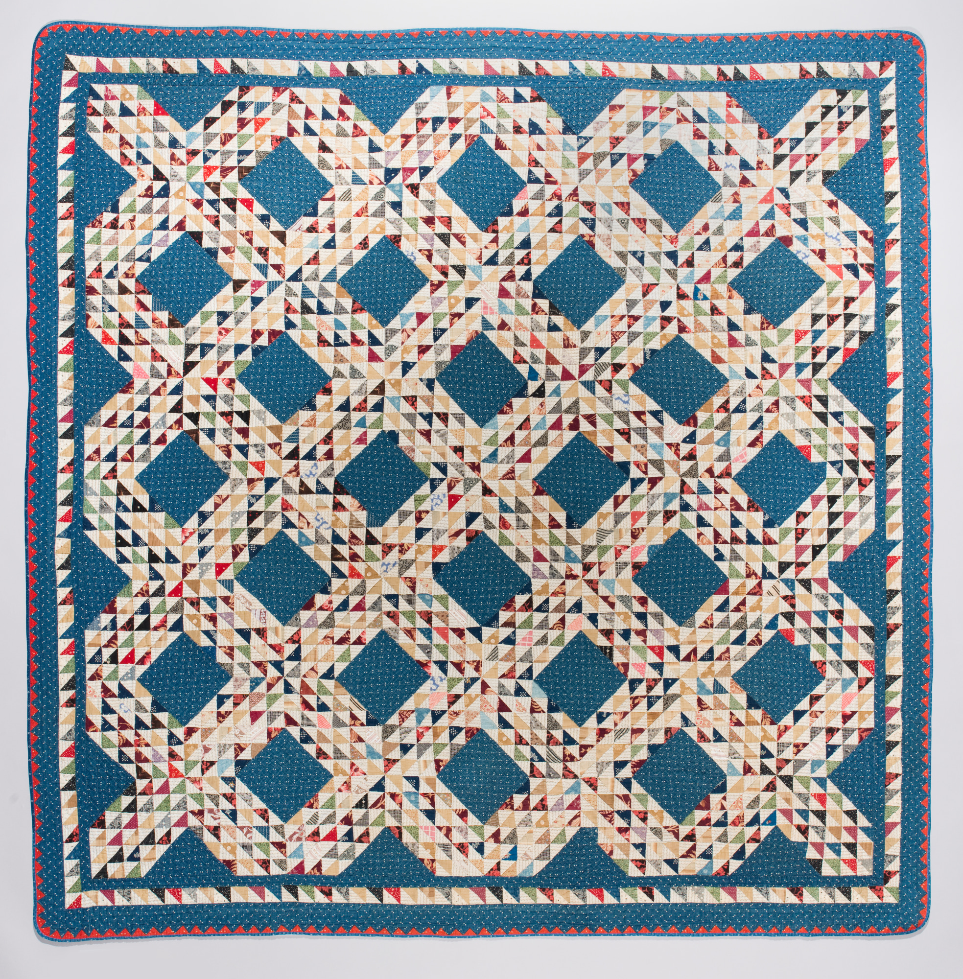 Ocean waves centered on blocks of cadet blue, tiny triangles and finished with pieced border of triangles. 12 st. in. Blue binding. Back is small blue/white (homespun style) checks. Quilting is chevron, diagonal line and squares at 7/8”. A graphic work of art composed of 3852 1 1/2” calico and check triangles in the waves and sawtooth border. Four borders, two blue, one sawtooth and the outer border of 250 appliqued red triangles.