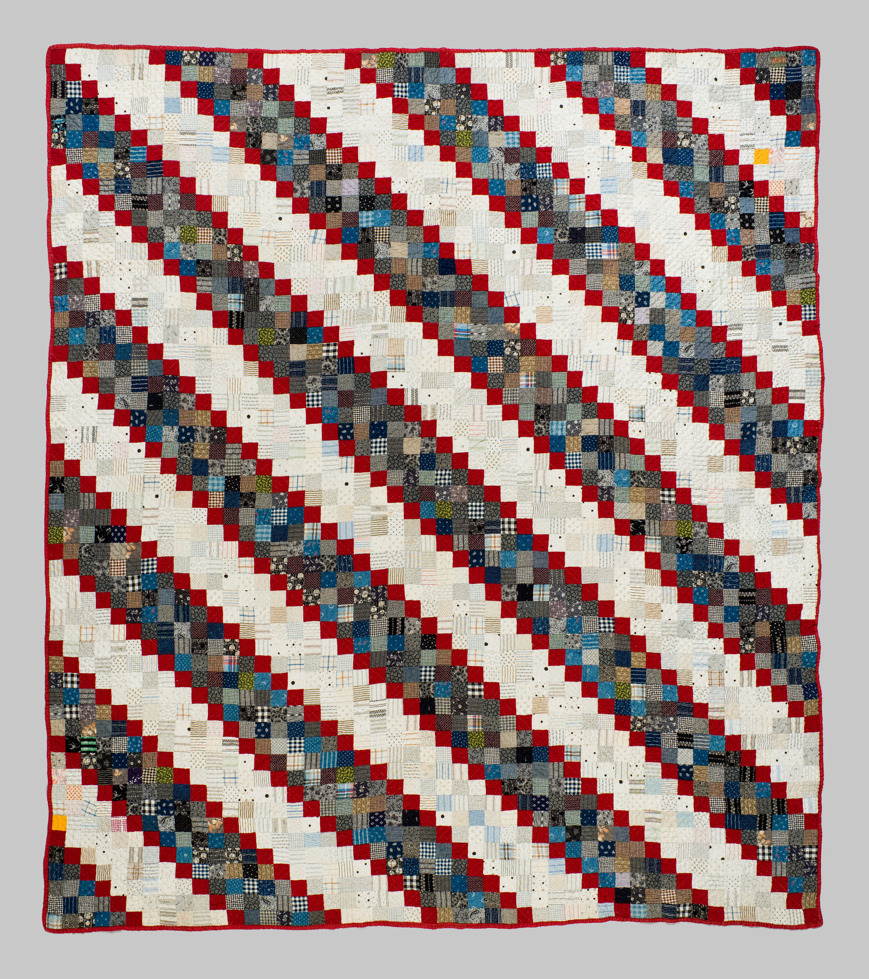 Pattern is 1 1/2” squares in diagonal stripes with five pieces of off-white with blue or black print, 1 red with 5 black pin dots, 5 pieces navy or black prints. 1 red, repeat pattern beginning with white. The beginning and ending white stripe each have a bright orange yellow piece, pink floral piece and a peach ground with red cherry print. These are the only places where these seemingly out of place pieces occur. Solid red binding machine stitched with black thread in the needle and green bobbin thread. Construction: hand pieced and quilted. Quilting rows 1/2” apart, zig zag pattern.