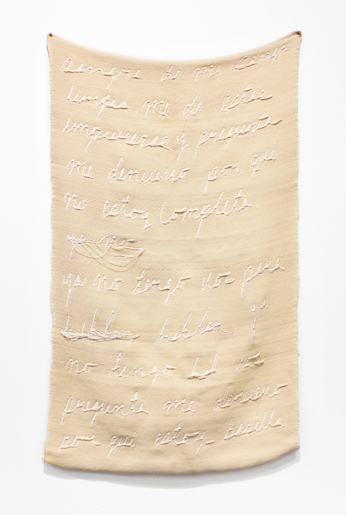 Carolina Cuevas was Artist in Residency from January to March in 2021. The cream monochrome, Jacquard weaving, has a hand-written poem by the artist that has been translated into a weaving pattern. The words are meant to seem like scars on the fabric.