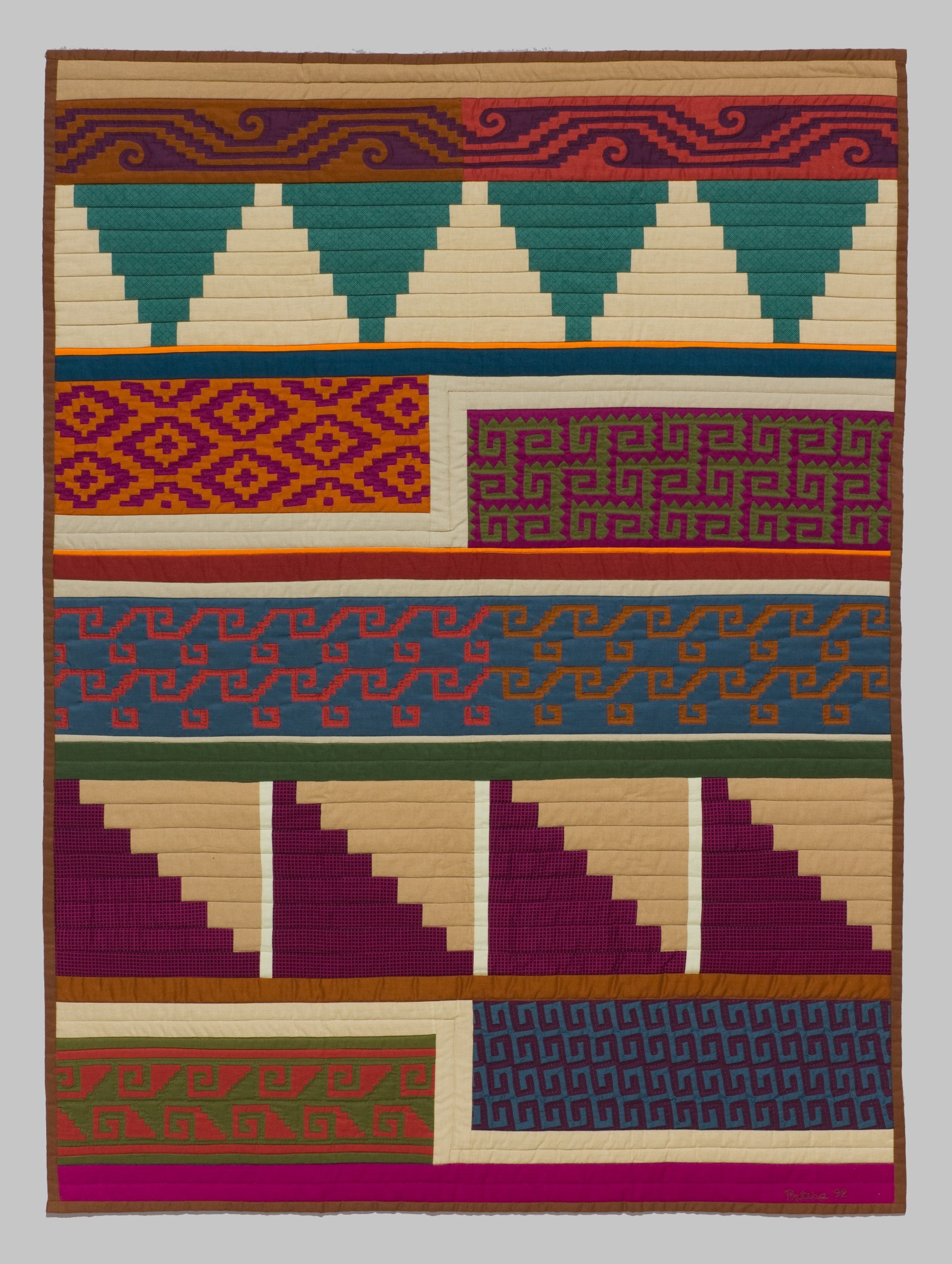 Inspired by mosaics in Zapotec ruins in Mitla near Oaxaca Mexico. This quilt features panels of geometric designs and vibrant colors. Some of panels have patterns repeated all the way across, changing color scheme halfway while some panels change design and color halfway across the quilt. The symmetry and its subtle disruptions invite the viewer to get lost in exploring the designs throughout the quilt.