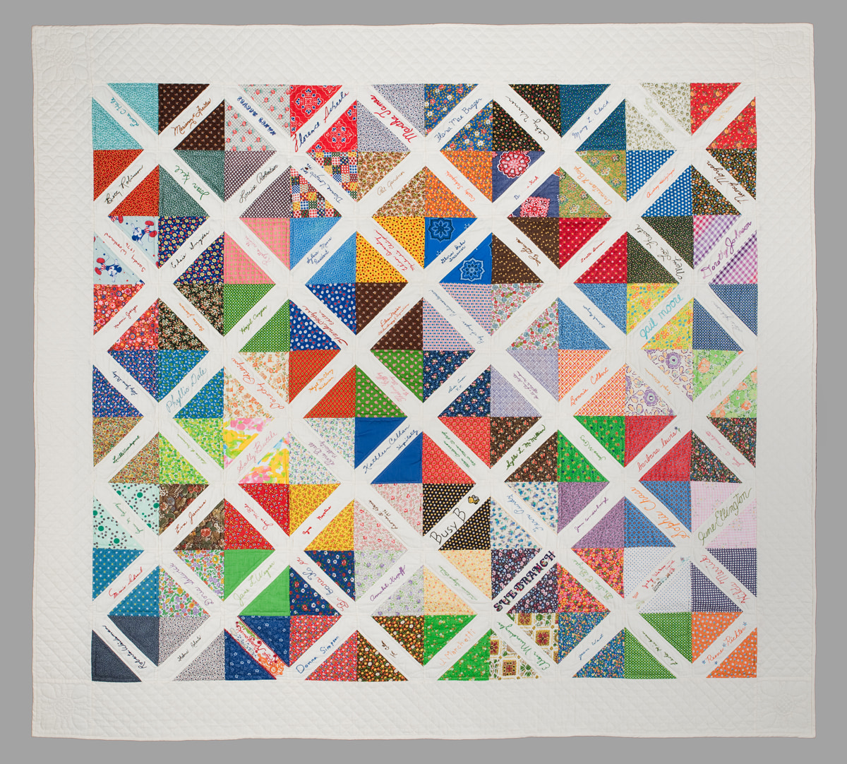 This quilt consists of individual blocks made by hand by first-year Santa Clara Valley Quilt Association (SCVQA) members. Members were given the white strips and asked to embroider their name and select their own color fabric for the block interior. A committee hand pieced the top and hand quilted the quilt. All members were invited to help quilting, regardless of their experience as quilters.