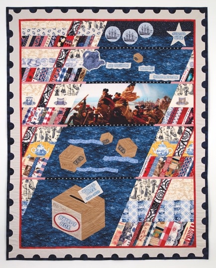 Suffragists in 1873 protested at the centennial of the Boston Tea Party with cries of "No taxation without representation." In the years that followed, individual women and women’s groups hosted tea parties to support the right for women to vote. I designed this quilt as if it were a commemorative postage stamp depicting tea crates floating from Boston to Washington, DC, where they are transformed into a ballot box. The suffragists’ ultimate success was achieved by persevering state by state.