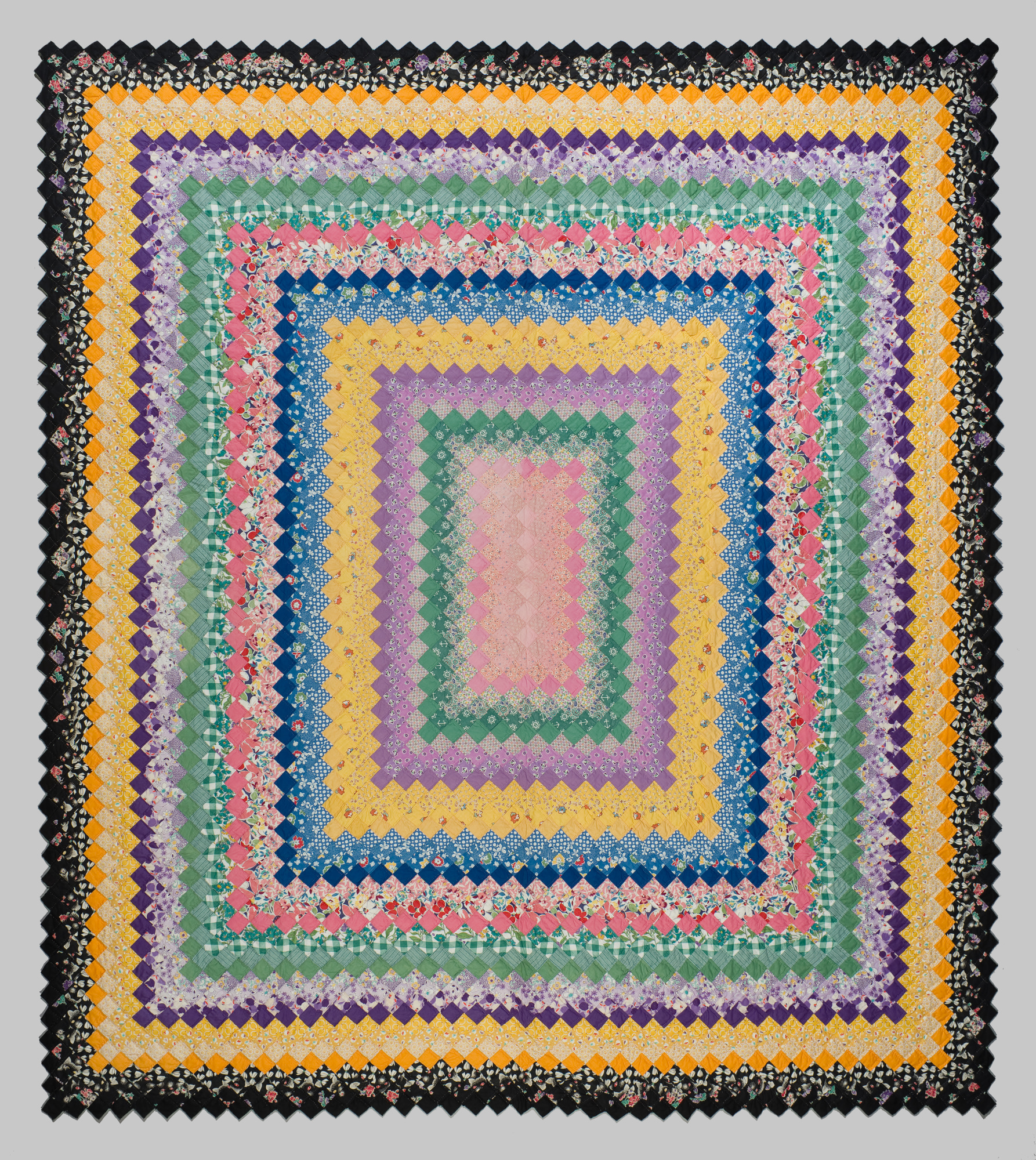 Postage stamp on point in ‘rectangularly concentric’ edge with a serrated finish and quilted cross hatch. Finished with an English style whip stitch at edge. An excellent example of a popular quilt of its era.