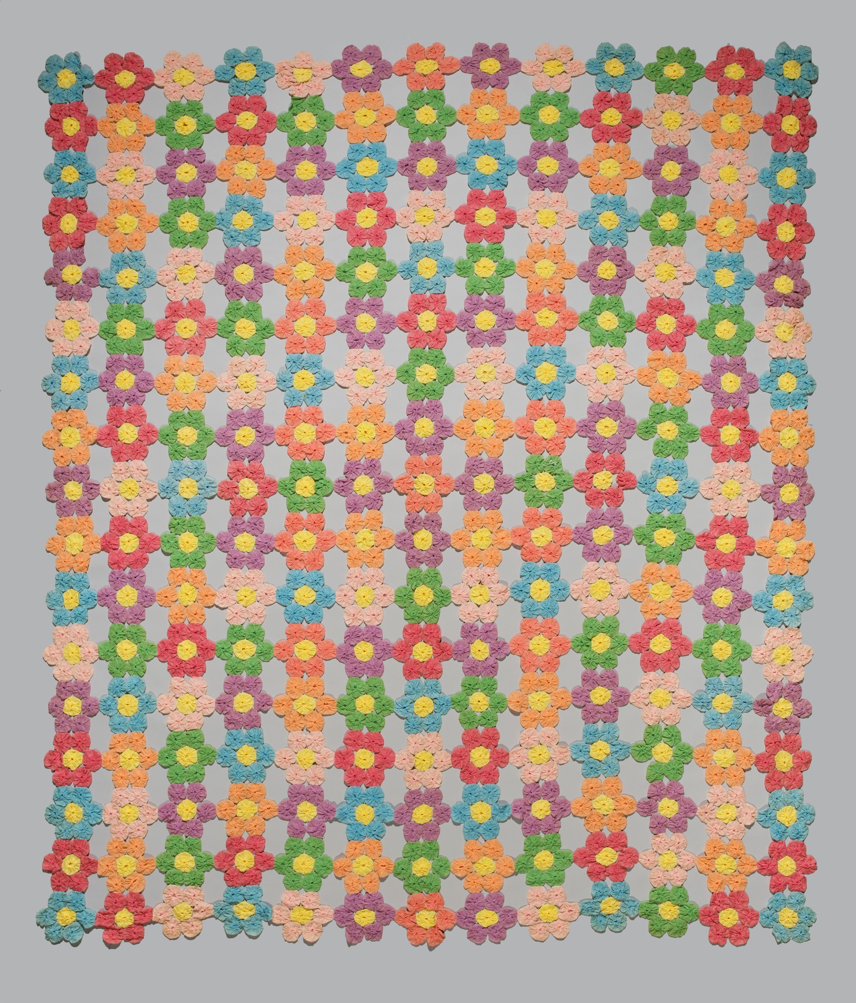 Used on the guest bedroom twin beds. Unique variation of yo yo spread with flowers made from yo yos with yellow centers. Only loosely stitched to feature the floral design.