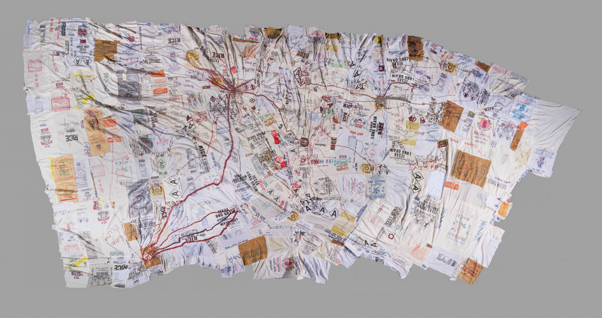 Yu Mai Gee Fon, 1986–2004, is a visual homage to Wong's immigrant parents, Gee Seow Hong and Gee SueyTing. Started in 1986, Flo Oy Wong, began sewing rice sacks together. She would later realize that the work came to depict the shooting of her father in April of 1940. It become a homage to her family coming together during a traumatic time, her father (who survived the attack) and her mother who did not stop to find the man that shot her father. “Yu Mai Gee Fon,” which means “there is rice to cook for dinner.”