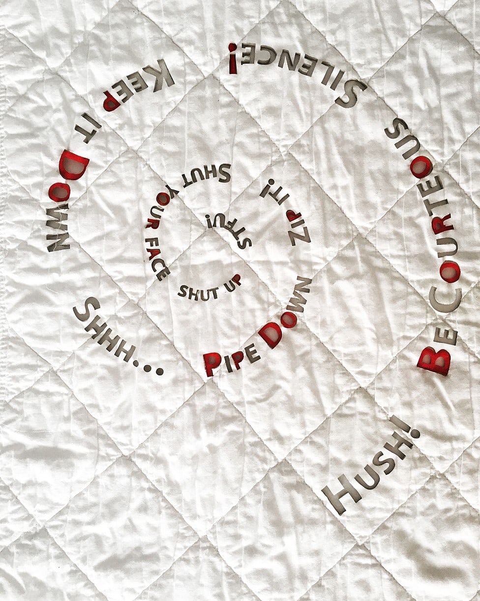 From the artist: Spiral of Silence was inspired by the US Senate, particularly the way they treated their own. In 2017, Senators Elizabeth Warren and Kamala Harris were making statements and asking questions when their (male) colleagues attempted to silence them through obscure procedures and through the thinly disguised mechanism of courtesy. Nevertheless, they persisted! How many other ways are we being silenced? Who wants us to be silent? What are they afraid of hearing? What are the words they fear and what actions might those words inspire?