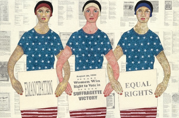 Para este proyecto, tuve la suerte de encontrar un libro dedicado a las partituras sufragistas con canciones que se remontan a 1875. Las páginas de un libro real constituyen el fondo de mi colcha. La letra me abrió los ojos. Cuando me involucré por primera vez en este proyecto, pensé que el movimiento sufragista se trataba estrictamente del derecho al voto. Sus esfuerzos por tener éxito prepararon el escenario para los esfuerzos de base que vendrán, demostrando que ciudadanos decididos pueden lograr el cambio.
