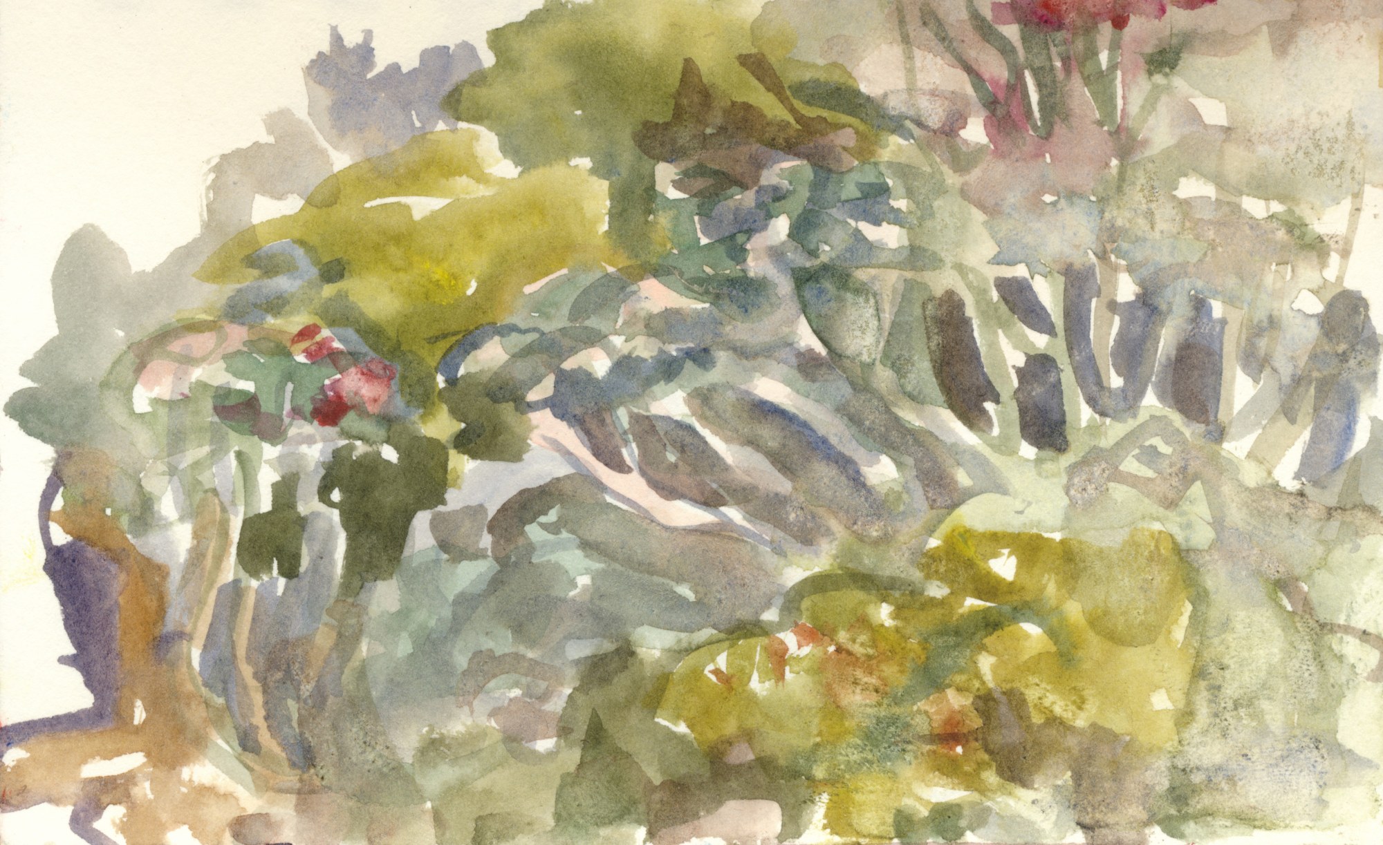 Edge of the bush on Korapuki (an uninhabited isle of the Mercury Islands), with pōhutukawa trees blooming red on green as they do every December.