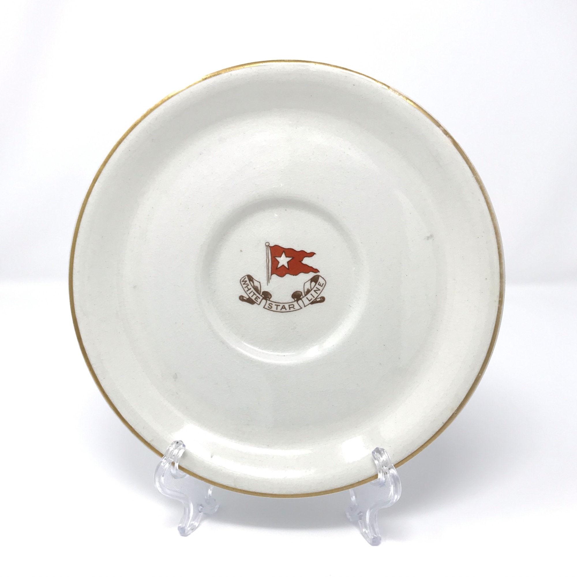 This heavyweight and rather utilitarian plate is believed to be a bullion saucer, and part of the deck service. An interesting tidbit of history about this pieces is that even though all White Star Line china is relatively rare, these pieces seem to come up more often than others - likely because they were exceptionally easy for a passenger to tuck into a coat pocket and pilfer.