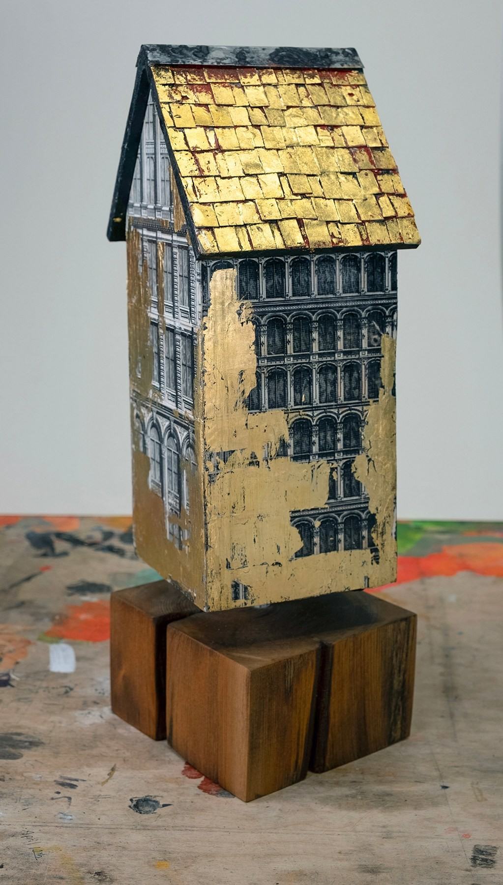 wood, aluminum, acrylic, carbon transfer, gold leaf