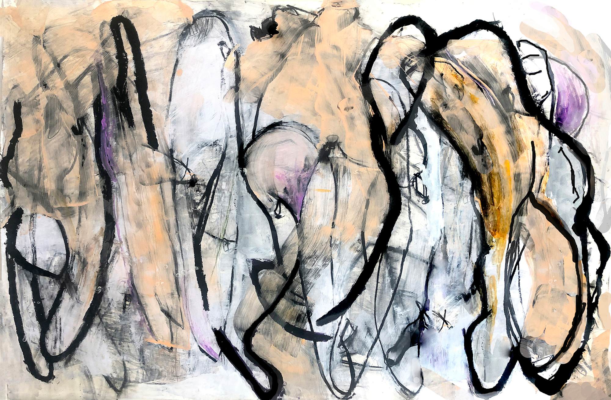 Acrylic and house paint, soft charcoal pencils, india ink on paper