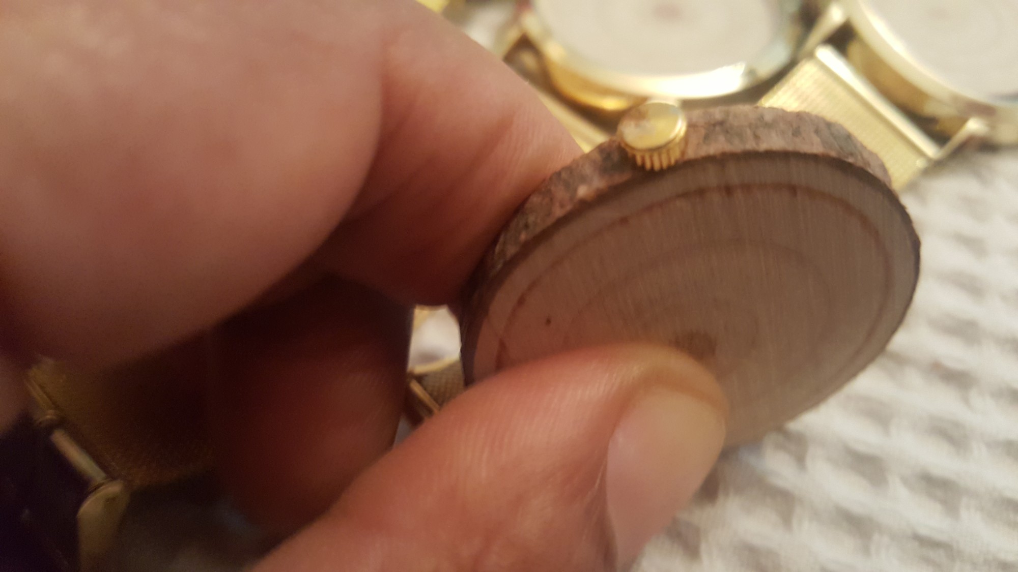 Unseating Western dominant notions of time, having time told to us. I wanted to work over the watch, the gold watch in order to revision an understanding of time that is beyond dominant Capitalist Western thinking but yet close enough to that methodology to be credible and understandable. Children in the West know that you can count the rings of a cross-section of a tree and use that to tell about time. The circles are close to a spiralistic notion of time that I have researched in time concepts on the continent of Africa.