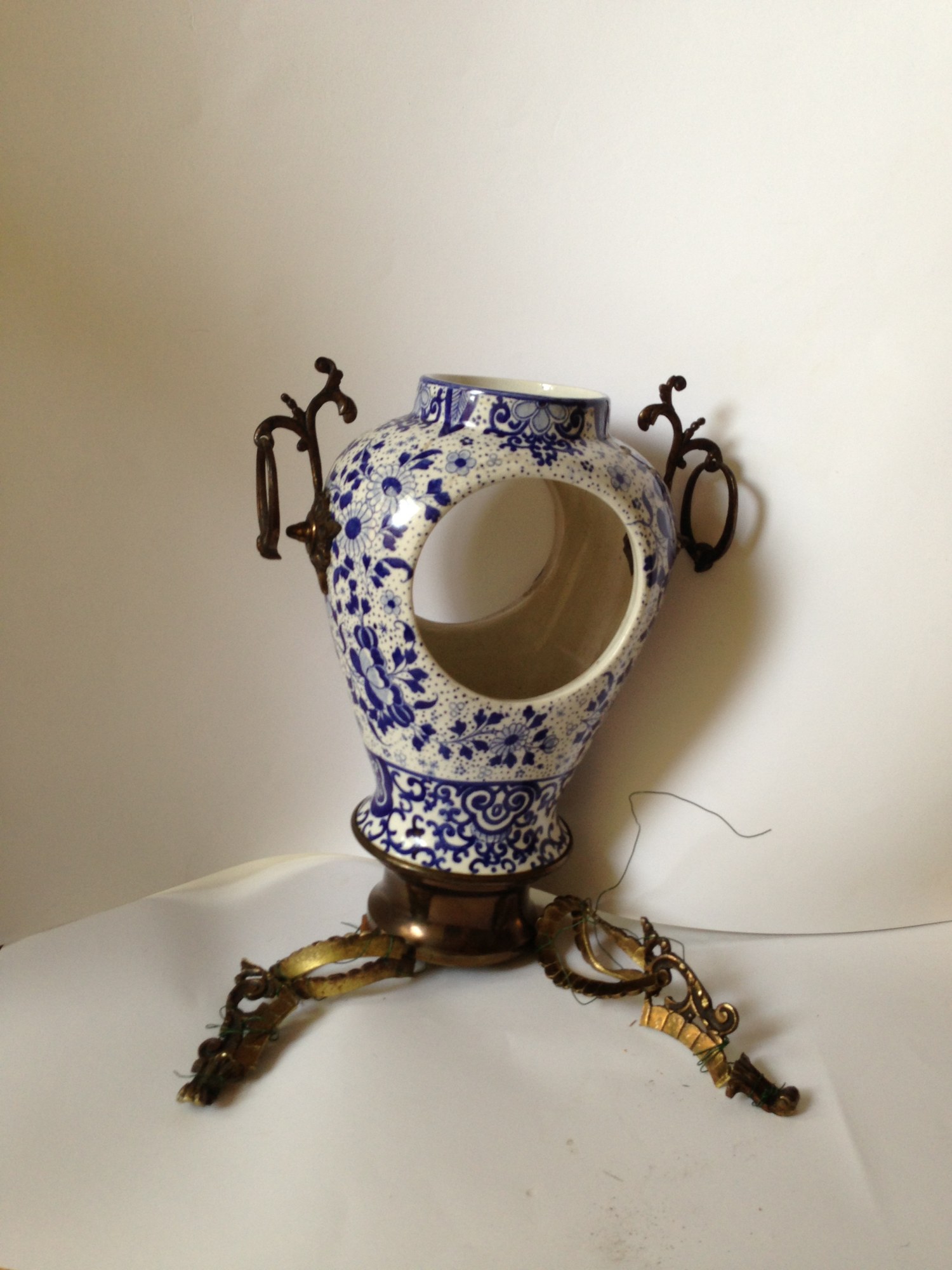 When I found this piece I felt it was was struggling to become. Because of it's tiny lion paws it symbolizes a living thing that is captive in service. I rejoined the legs lengthened them by unraveling their scrolling pattern. I did this to articulate better the will to stand that I could see in the piece. I also wanted to show the splay that these legs had been designed to have. Their position meant using those legs is made almost impossible. This furnishing (a carriage clock) could no longer do it's job so to speak as the clock face had been removed. The absence in the torso was for me very moving. The piece was in a sense free of it's labour but also looked like it was a vase not broken but not able to do the work of contain anything anymore because of the holes. Now it is doubly free but still stuck and it seemed to me to be continually articulating that stuck state. The absence in the middle spoke to me of it's previous soulless labouring existence marking time for someone, and everyone else, and the horror of nowhere else to go after that.