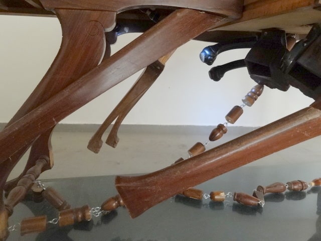 This work is based on a merchants Table that the Gallerist Antonio Sarmartino helped me find in Trappani. All parts of the original table were used in the re articulation of the table. The glass upon which the piece now stands was the counter of the table. Underneath this glass counter in blue fabric objects for sale were displayed the table top was for transactions. Additional wood was found in the municipal wood dump and brought from France England and Germany. The floats were given by a fisherman in Trapani. The table spoke of the sea. Under the table I have placed many legs most of which can only be seen indirectly in the reflection of the glass below. It is not possible to articulate the amount of migrants that drown crossing the sea, this dim refection is a visual representation of the bottomless loss in the unfathomable sea depths. Under the glass is a black oilcloth table cloth. I have worked extensively with these table cloths before. It is interesting that oil pipelines facilitate the crossing of oil across this stretch of land that is so treacherous for Africans. Many migrants spoke of clandestine night time crossings using the stars and the searchlights that "found" them. I integrated lights into the bottom of this piece as a result of these conversations. The sea is omnipresent in Trappani it appears to be such a wide open and pleasurable space. The reality is that it is a grave a locked space of trade is in the table that has a coffin like structure. In one of the locked draws under the table legs spill out stuffed in like migrants stuffed into un-seaworthy vessels. Under the table legs of all ages that have fallen into the water step over water borne boundaries. Some are misshapen as legs seen though the distortion qualities of water. The sea as a locked space of trade the people merely objects things flotsam, driftwood, under the table. And yet there is an integrity to this movement that is invisible from above, the legs are a collective of sorts the journey has an epic quality a tenacity that provokes a kind of awe. The journey is a kind of animal, perhaps a trickster animal, stepping over corpses, the sea in a coffin it's burden.