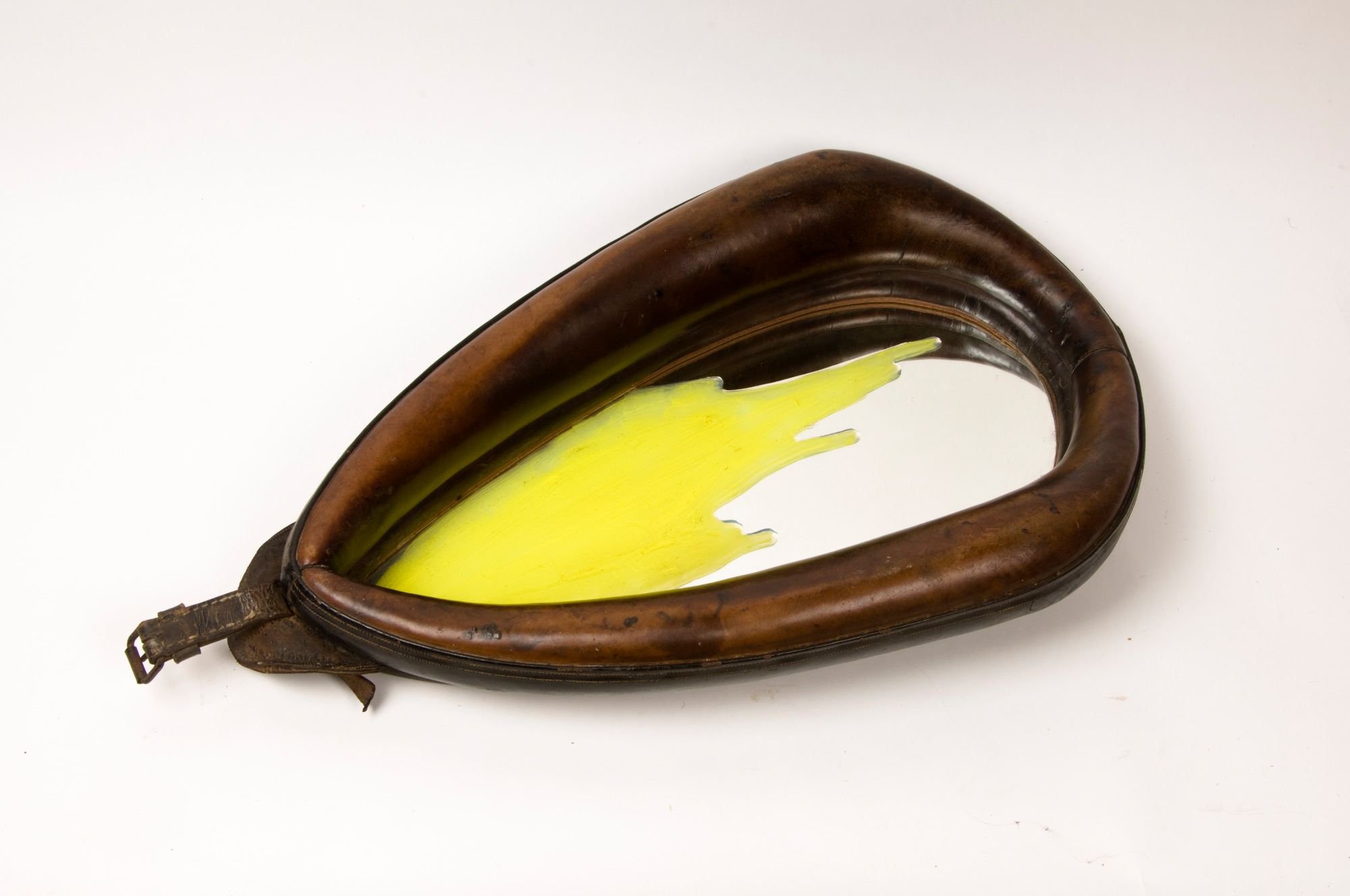This last and final work is a return to furniture. This horse halter like many abandoned horse halters was re-appropriated for the home as a mirror. Many defunct horse halters were worked into furniture as a kind of nostalgic reminder of "the olden days", the chains are removed the straps unbuckled. I "painted" this piece by pulling it along the ground. The color has been added to record this forward movement. I was interested in the unbroken quality of this halter, and how it could move into the world re-purposed but with a discrete past. The other halters in the series were on blinkered horses, endlessly crossing the fields, forward and back. This one may have had similar usage but it is not apparent. I knew this piece needed to be on the floor when my Daughter planted a leg each side of the piece and looked down at her reflection with loud joy. The chant of this series had culminated. The kind of oratory articulation of these rather loud tools ended with this piece.
