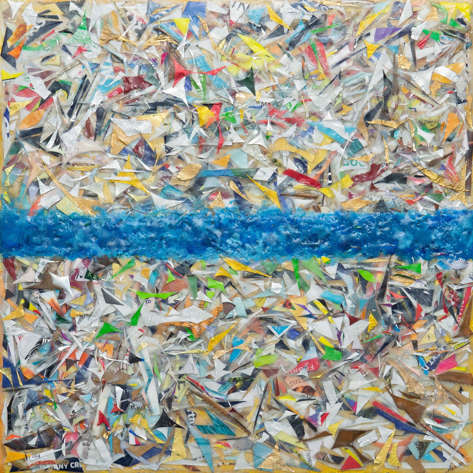 using the remnants of the cut urban waste as texture and color, i embedded them into the encaustics to create these studies of the colors where the sky and sea meet at the horizon