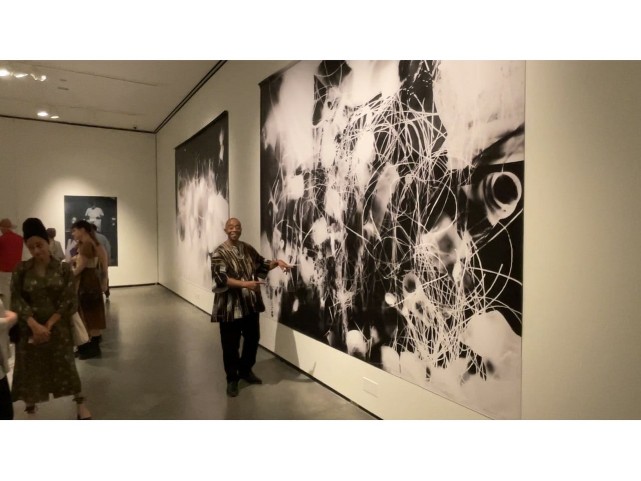 Pinhole Photographic negative, 12' x 10' image of objects placed inside of a 16 x 22 inch pinhole camera - constructed using old boards from the Wallace Plantation in Harpersville, AL - 2022 Alabama Triennial at AEIVA Gallery, Birmingham, AL