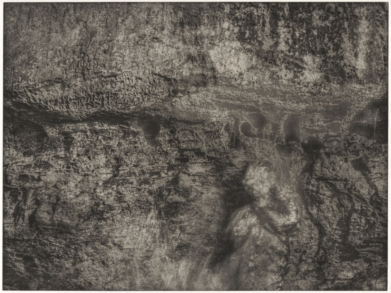 This image began by photographing myself moving underneath a silver emergency blanket during very long exposures. I edit the photograph digitally to produce a transparency that I use to create a photopolymer gravure plate, which I ink in an intaglio-style method and print on a traditional etching press.