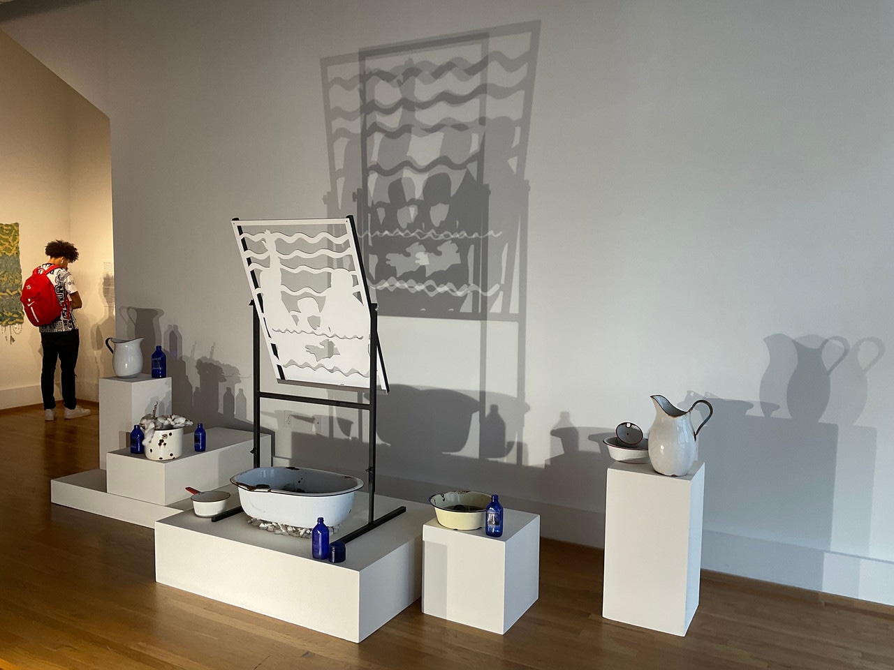 Down By the Riverside - The Baptism-steel cut panel/frame, QR code linked audio (original music- The Water: Three African American Spirituals), lighting, mixed media(vessels, blue jars, enamel basins w/shell adorned clay sculptures). 36" x 24", Installation-3x3x2x11', 2022. Mixed media installation. The central image honors faith and baptisms, spiritual practices that have enabled the black community to endure from times of enslavement and the strength to survive in the present moment. FLOW Tuscaloosa Project. Paul R. Jones Gallery, Tuscaloosa, AL.