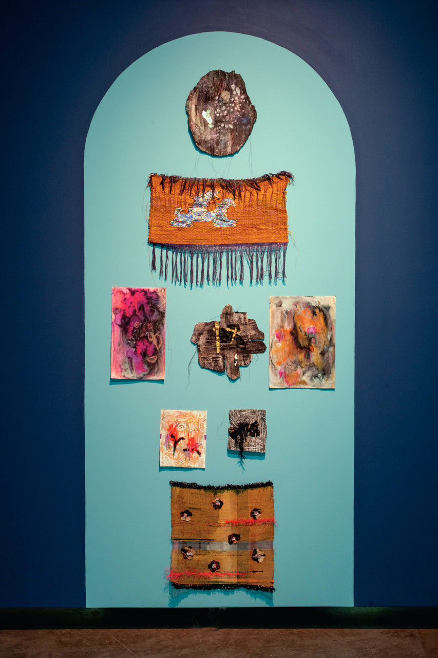 handwoven tapesty with wave imagery, charcoal and oil pastel on paper, duct tape, denim, bleach