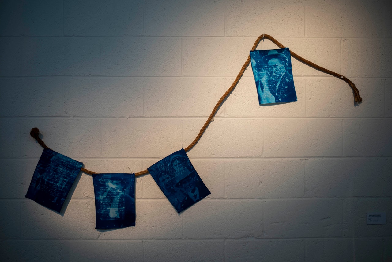 Cyanotype images of 1905 Mobile lynch mob with found hand written letters. Following the SOIL Project’s theme of lynchings in Mobile, I made an installation of cast bronze railroad trains, archeological artifacts from Down the Bay community in Mobile, cyanotypes, film projection and morse code communication techniques. ACAC Gallery Mobile, AL, 2022