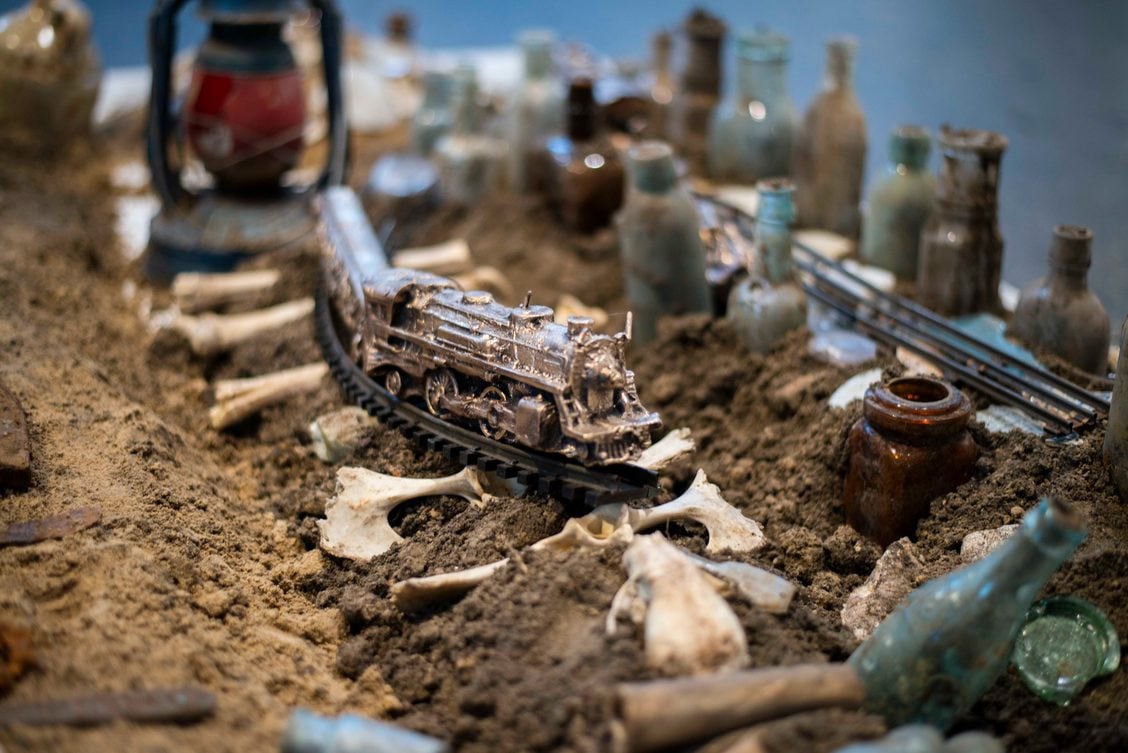 Soil Project - We Got Both Niggs, 2022. Mixed media installation, cast bronze railroad trains, found archival bottles, railroad lantern, earthen mounds, animal bones, toy train track, slate school board, film projection. Following the SOIL Project’s theme of lynchings in Mobile, I made an installation of cast bronze railroad trains, archeological artifacts from Down the Bay community, cyanotype images of lynchers, film projection and morse code communication techniques. ACAC Gallery, Mobile, AL, 2022