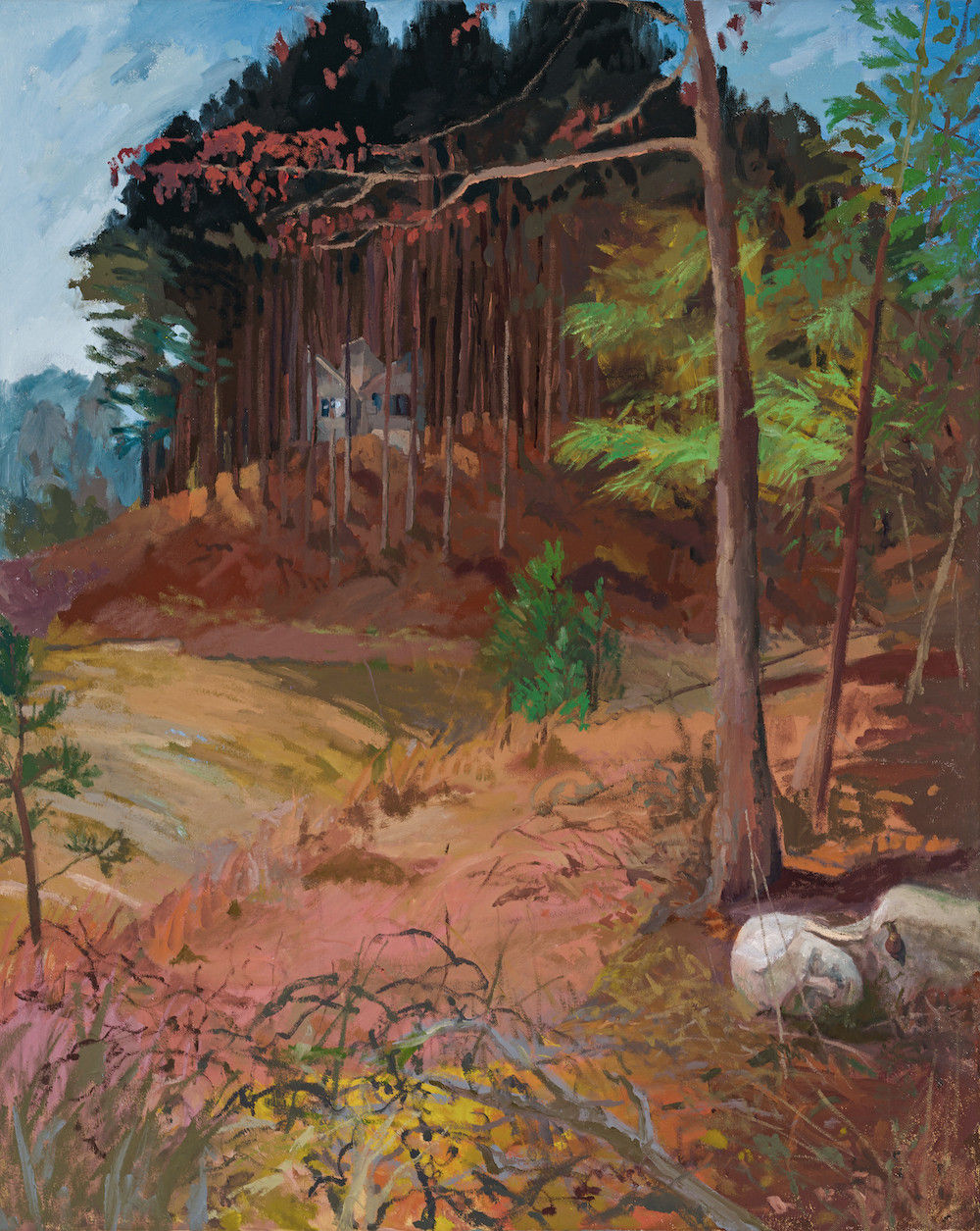 This painting is about distance and longing as well as covering and unearthing. It's unclear whether the house and the figure, so far away from each other, are being revealed or slowly consumed by the trees and ground. There is a sense of burial even amongst the many upsurging of lines created by the pine trees.